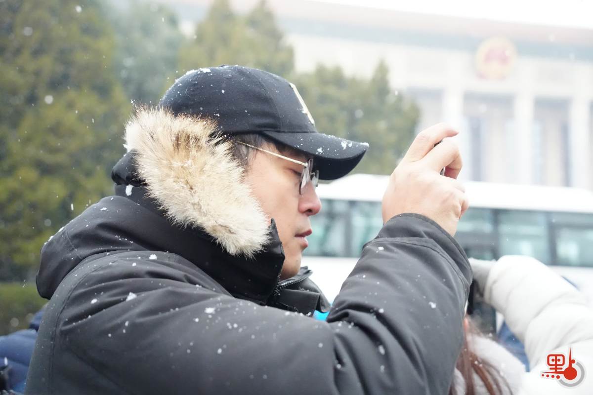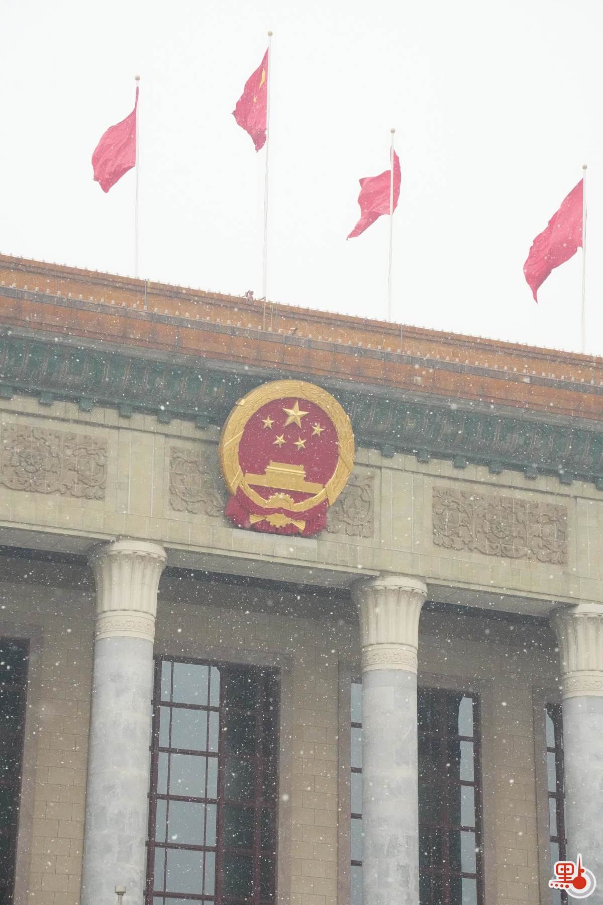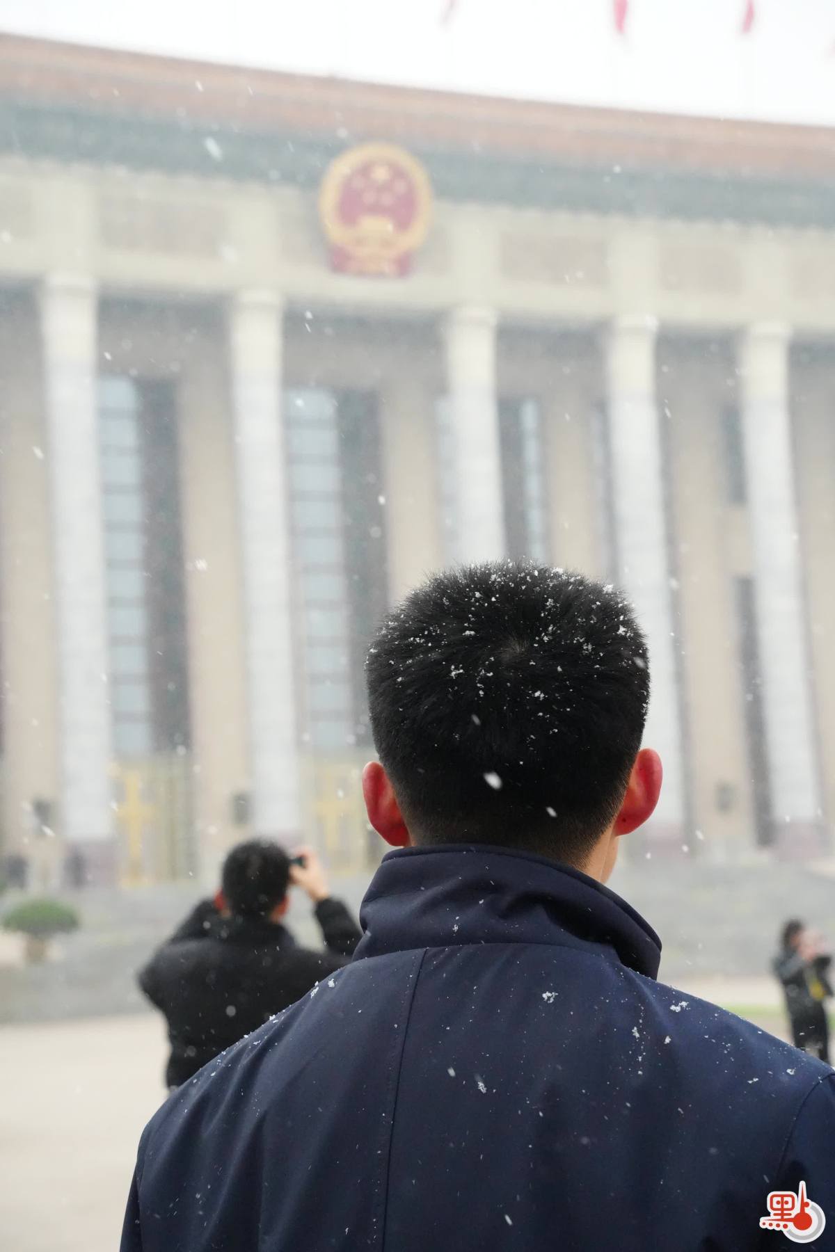 今日上午11時許,點新聞記者在人民大會堂外看到,天空中飄起鵝毛大雪,雪愈下愈大,許多媒體從業者在外等候入場,頭髮上與背包上落滿了雪。除此之外,場外的武警官兵、交警與軍犬亦在雪中守護秩序。