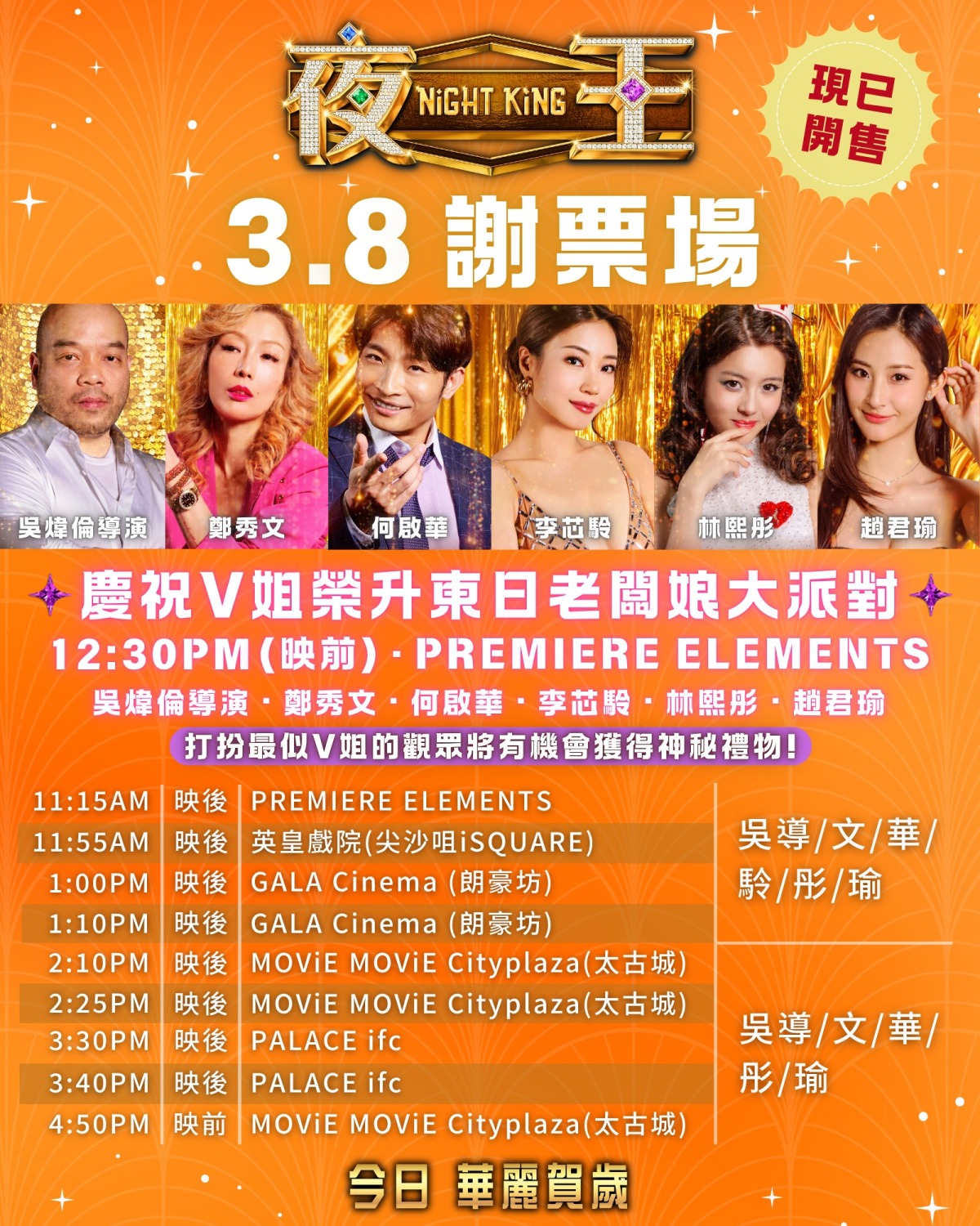 片方還透露,當日中午12時30分PREMIERE ELEMENTS(映前)場次還設有特別驚喜,屆時現場裝扮最似V姐的觀眾,更將有機會獲得神秘禮物。
