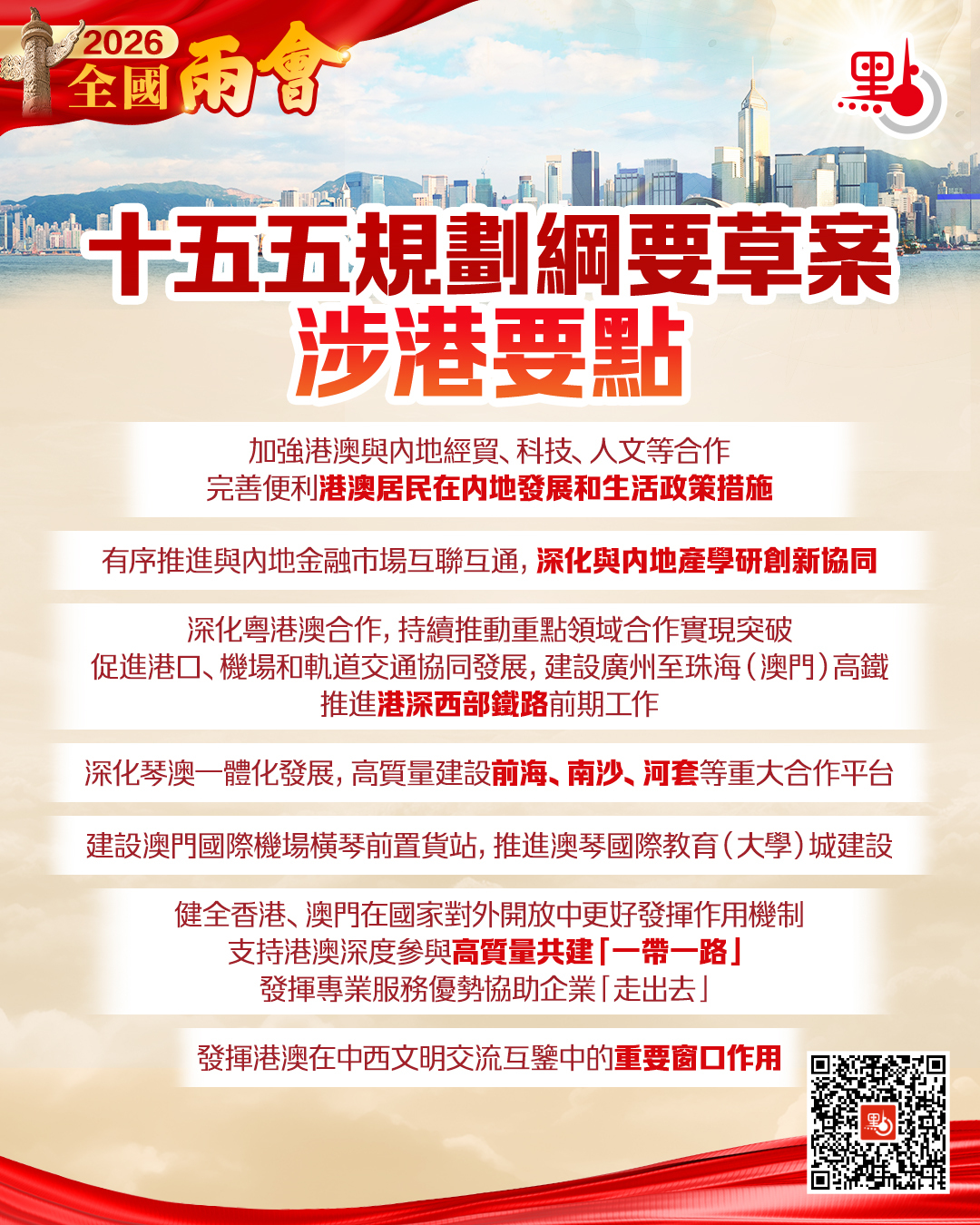 第二節是「支持港澳更好融入和服務國家發展大局」。「十五五」規劃綱要草案提到,加強港澳與內地經貿、科技、人文等合作,完善便利港澳居民在內地發展和生活政策措施。有序推進與內地金融市場互聯互通,深化與內地產學研創新協同。深化粵港澳合作,持續推動重點領域合作實現突破,促進港口、機場和軌道交通協同發展,建設廣州至珠海(澳門)高鐵,推進港深西部鐵路前期工作。深化琴澳一體化發展,高質量建設前海、南沙、河套等重大合作平台。建設澳門國際機場橫琴前置貨站,推進澳琴國際教育(大學)城建設。健全香港、澳門在國家對外開放中更好發揮作用機制,支持港澳深度參與高質量共建「一帶一路」,發揮專業服務優勢協助企業「走出去」。發揮港澳在中西文明交流互鑒中的重要窗口作用。