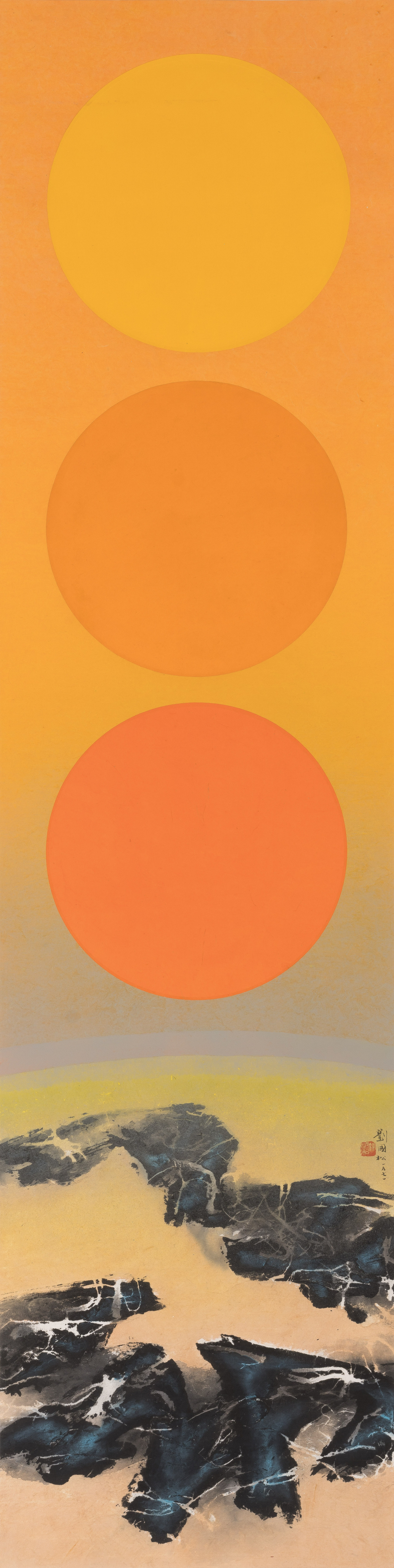 劉國松《變色的太陽》(1971),此畫為「太陽行」單元的展品。1968年12月,美國太空人拍攝了著名的「地出」照片,那是首張由人類在月球軌道上拍攝的彩色地球照。畫家劉國松受到啟發,自1969年起結合中國水墨與西方拼貼、塑膠彩等技法,創作出《太空系列》。此畫作為該系列作品之一,以另一個更廣闊的維度,表達時間的流動。
