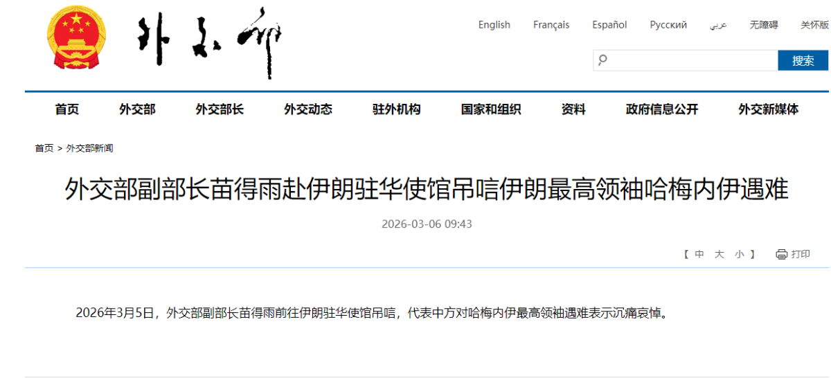 外交部副部長苗得雨赴伊朗駐華使館 弔唁伊朗最高領袖哈梅內伊遇難