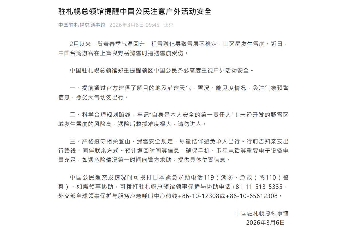 【點新聞報道】3月6日,中國駐札幌總領事館發文提醒領區中國公民注意戶外活動安全。全文如下: