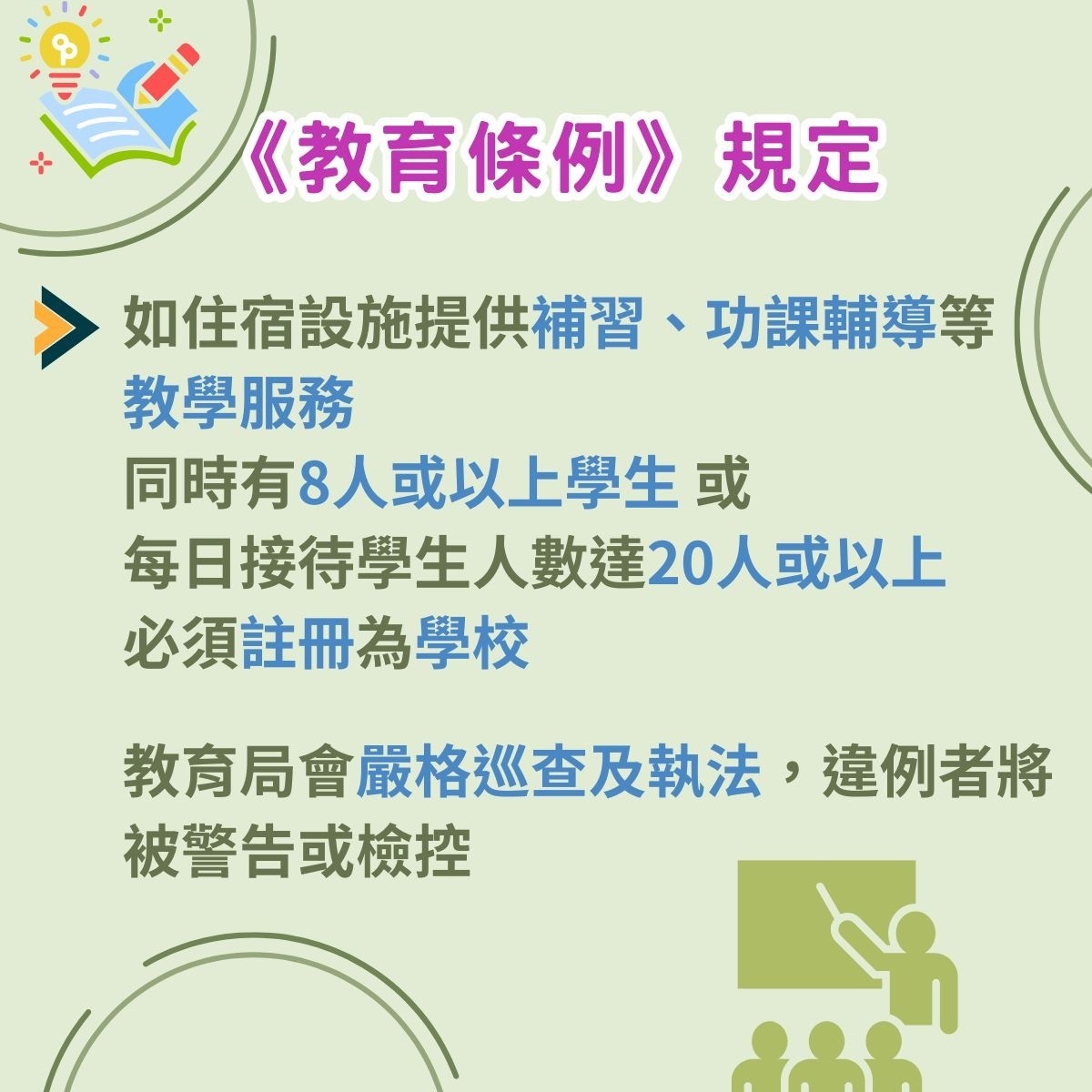 蔡若蓮指,如相關住宿設施提供補習、功課輔導等教育服務,而處所內學生人數同一時間達8人或以上,或每日達20人或以上,它必須已根據《教育條例》註冊或臨時註冊為學校,否則就是違法。