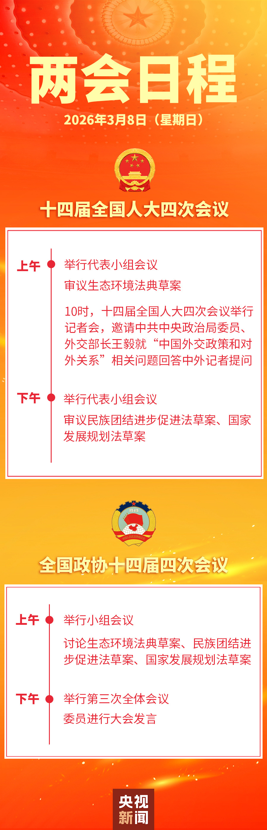 全國政協十四屆四次會議3月8日上午舉行小組會議,討論生態環境法典草案、民族團結進步促進法草案、國家發展規劃法草案;下午舉行第三次全體會議,委員進行大會發言。