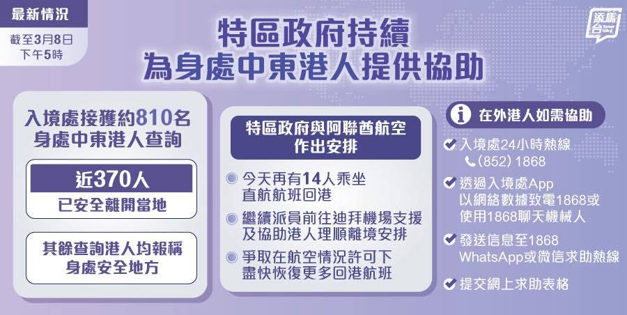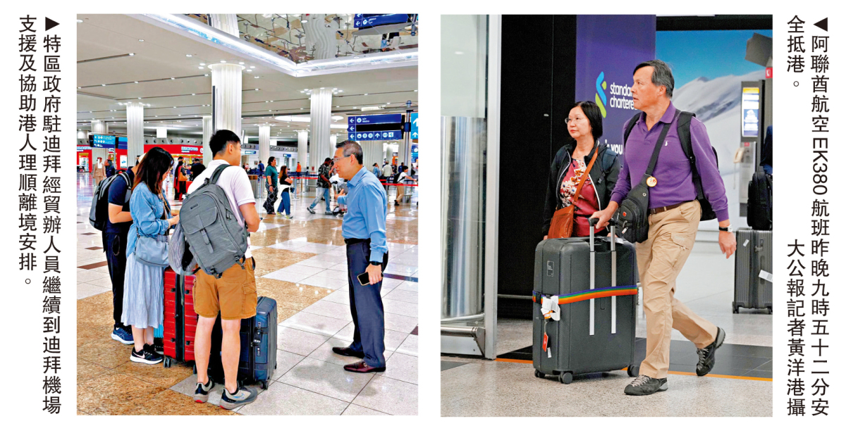 特區政府駐迪拜經貿辦人員昨日繼續派員前往迪拜機場,支援及協助港人理順離境安排。特區政府表示,會繼續與營運中東航線的航空公司保持緊密聯絡,爭取在航空情況許可下,盡快恢復更多回港航班。特區政府亦會繼續作適當安排,協助有需要返港的港人。