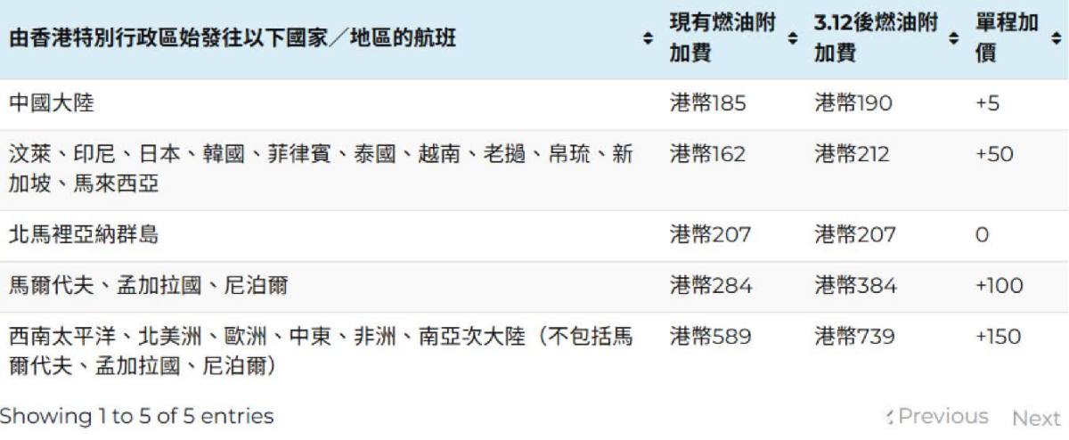 根據旅議會最新的客運燃油附加費列表顯示,香港航空公司在3月6日調整燃油附加費,短途航班由1月份162元,增加50元至最新212元,加幅約三成;長途航班由589元,增加150元至739元,加幅約25%。自上月28日以來,已有13間航空公司調整燃油附加費。