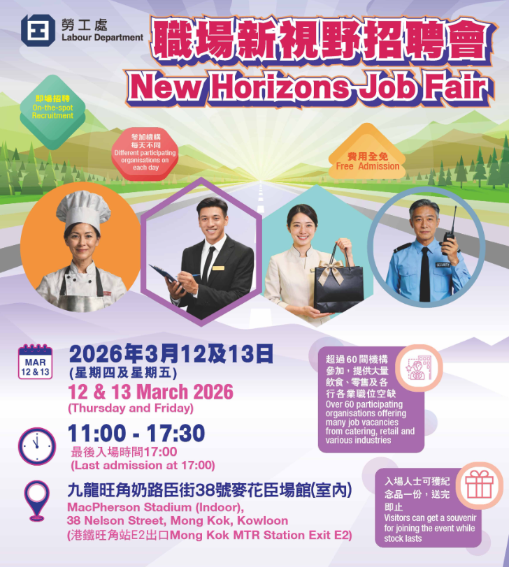 【點新聞報道】勞工處於本周四(3月12日)及周五(3月13日)在旺角麥花臣場館舉行職場新視野招聘會,共有超過60間機構參加,合共提供超過2900個不同行業的優質職位空缺,其中近2300個來自飲食業、零售業及運輸業。