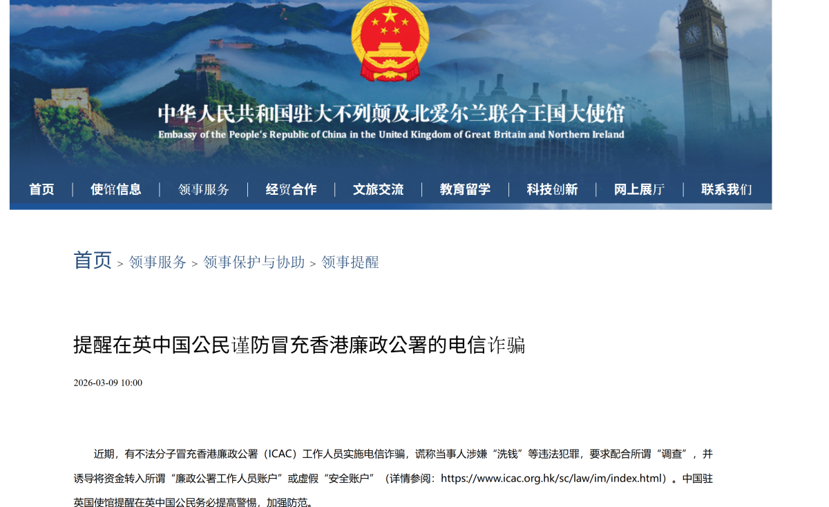 大使館指,近期,有不法分子冒充香港廉政公署(ICAC)工作人員實施電信詐騙,謊稱當事人涉嫌「洗錢」等違法犯罪,要求配合所謂「調查」,並誘導將資金轉入所謂「廉政公署工作人員賬戶」或虛假「安全賬戶」。中國駐英國使館提醒在英中國公民務必提高警惕,加強防範。