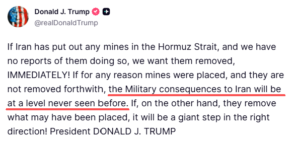 特朗普在第一條帖子中稱,伊朗如果在霍爾木茲海峽布雷,將面臨「前所未見」的軍事後果。他同時表示,美軍將「徹底摧毀任何試圖在霍爾木茲海峽布雷的船隻」。