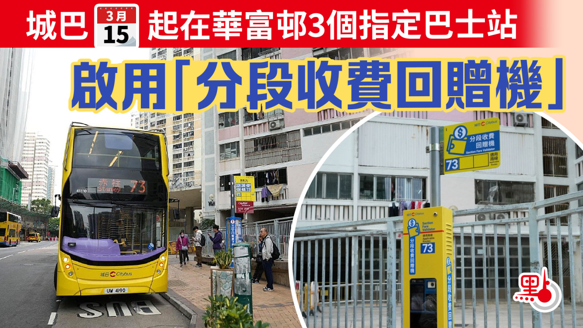 由本周日起,城巴將率先於華富邨3個指定巴士站啟用「分段收費回贈機」。城巴表示,以使用八達通或其他認可電子支付工具的成人乘客為例,乘客於數碼港道沿線巴士站付費登上開往赤柱市場方向的73號線巴士,並於華富(北)、華富邨華生樓或華富邨華泰樓下車,以同一支付工具於回贈機上「拍卡」或「掃碼」,可即時領取2.5元回贈。