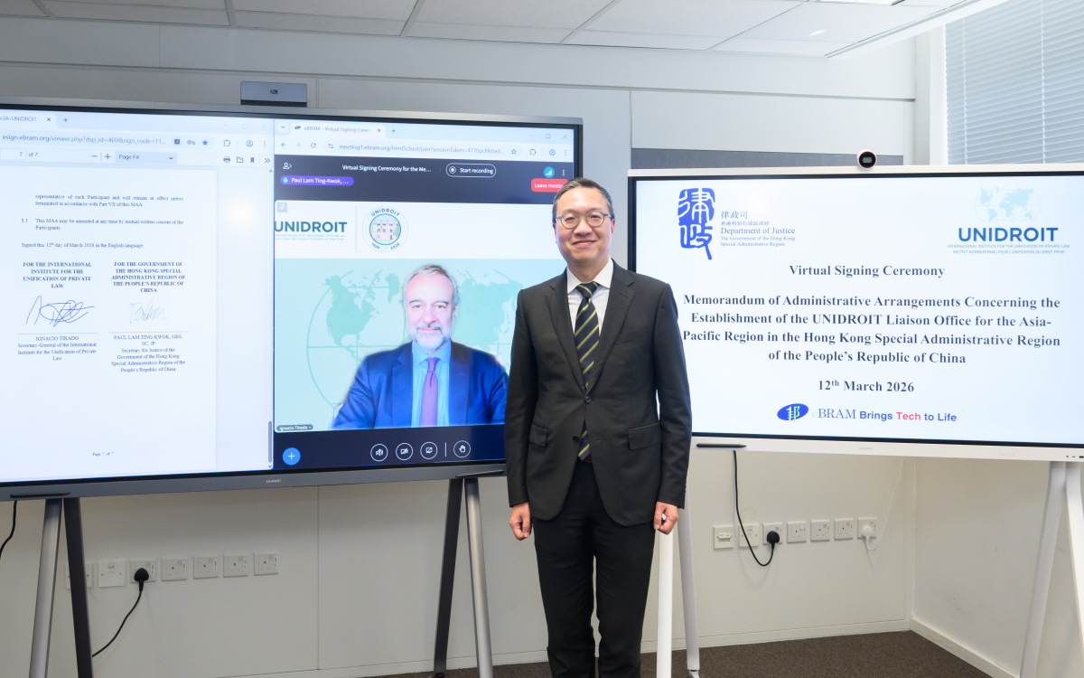 林定國在儀式上致辭時表示,香港特區作為國際法律樞紐,擁有穩健的普通法制度,法律體系備受國際認同,是私法協會設立其首個區域辦公室的理想據點。備忘錄的簽署是落實聯絡辦公室進駐香港的重要一步,標誌着相關工作全速推進。他感謝私法協會一直以來對香港特區和律政司工作的信任和支持,指聯絡辦公室預計將於今年11月開幕,屆時,律政司會在香港法律周2026期間與私法協會舉辦亞太國際私法峰會與百周年區域活動,進一步鞏固律政司與私法協會的緊密合作關係。