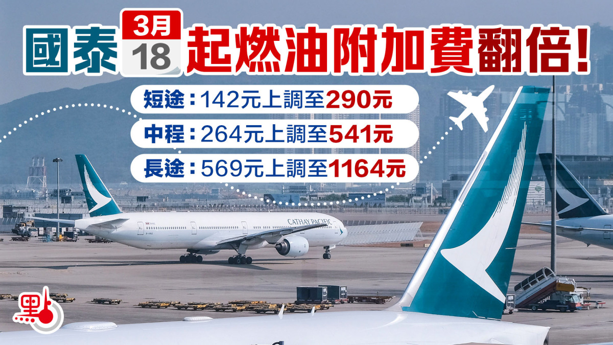 國泰航空宣布,根據現行既定機制,短途航班燃油附加費將由現時的142元上調至290元;中程航班由264元上調至541元;至於長途航班則由569元上調至1164元。