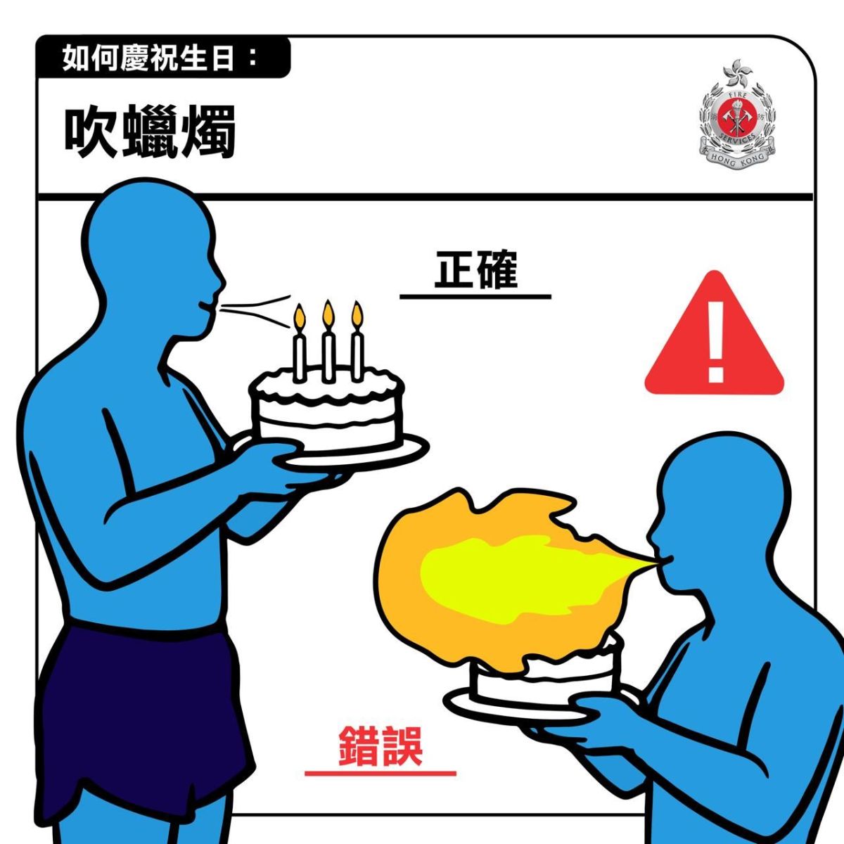 消防處表示,「噴火蛋糕」的吹蠟燭方法,是以含住易燃粉末或酒精,再噴向生日蛋糕上的蠟燭,製造噴火效果。消防處說,有關做法極度容易瞬間「搶火」,造成自己或周圍人士嚴重燒傷,甚至釀成火警,呼籲市民勿為「打卡」以身犯險。