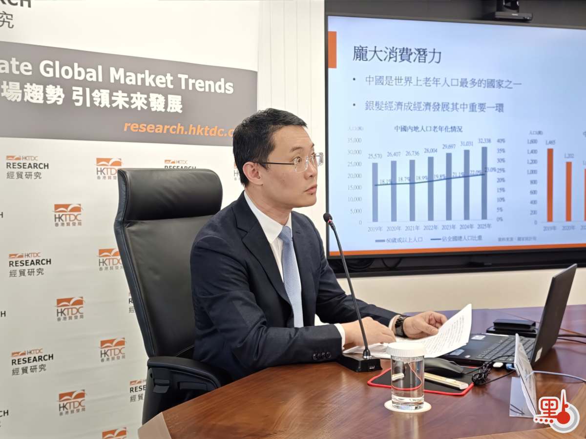 貿發局研究總監龐溟表示,有數據指,內地銀髮經濟規模於2024年達7萬億元人民幣,佔內地GDP約6%,預計2035年有望增至30萬億。他說,「佢哋唔再好似從前被動有養老需求嘅老年人,而係更加積極享受老年生活嘅消費者」。