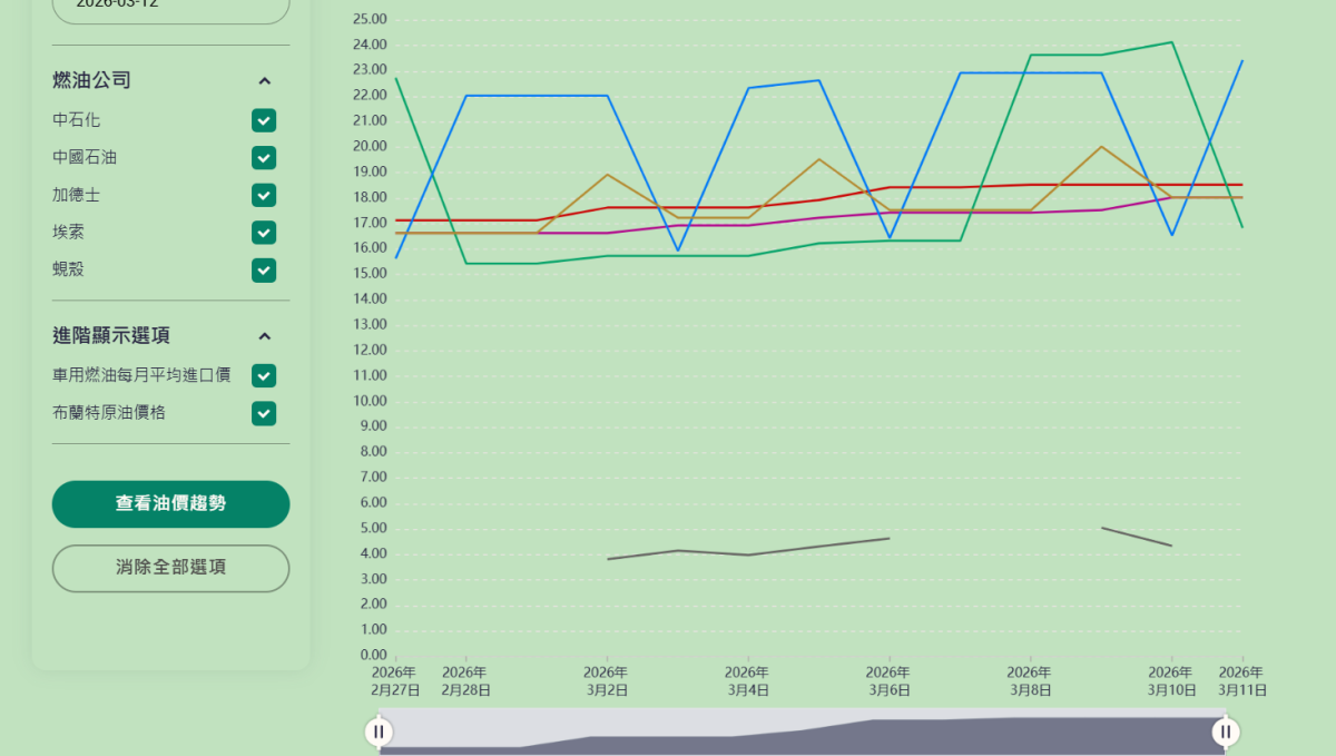 消委會指,一直持續監察本港車用燃油價格。今年2月下旬,中東地區局勢升溫,由2月27日至3月11日,本港5間油公司無鉛汽油的平均零售牌價均錄得顯著升幅。