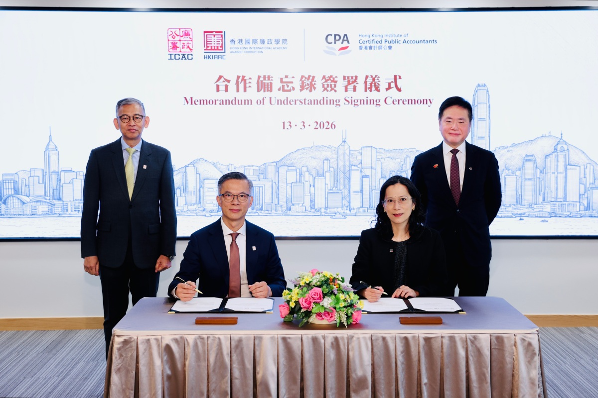 【點新聞報道】廉政公署轄下香港國際廉政學院(廉政學院)與香港會計師公會今日(13日)簽訂合作備忘錄。在合作備忘錄的框架下,廉署與香港會計師公會將進一步深化協作,包括促進人員交流與參訪和加強誠信培訓。廉政學院亦將與香港會計師公會共同開發其會員的自學課程,共同鞏固會計業界的廉潔文化。