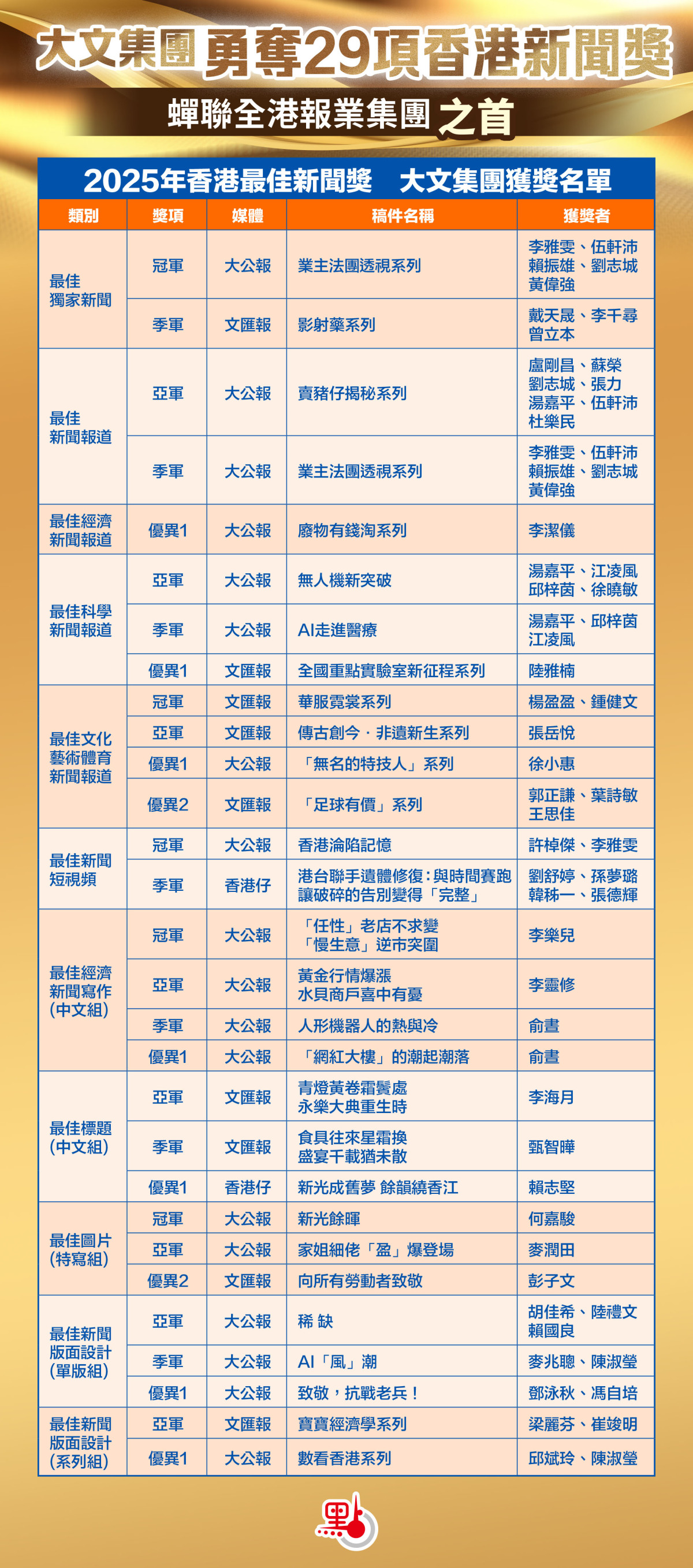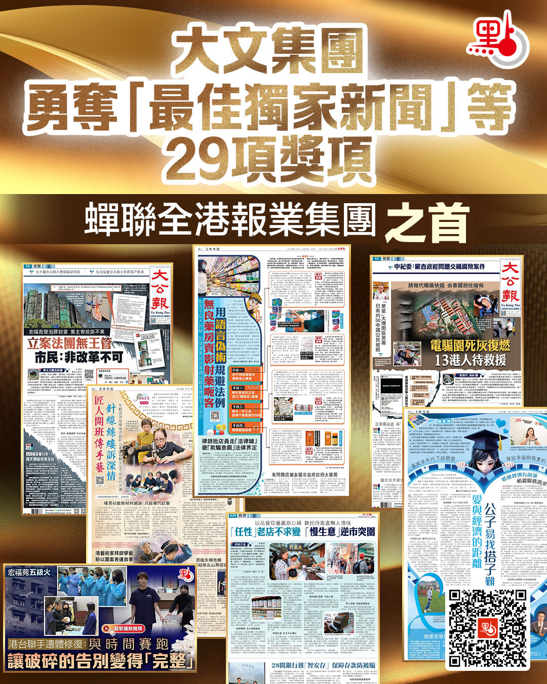 【點新聞報道】香港報界的年度盛事、由香港報業公會主辦的「2025年香港最佳新聞獎」今日(13日)公布得獎結果。香港大公文匯傳媒集團(大文集團)共奪得29個獎項,包括5冠8亞7季9優異獎,不僅獲獎數量創集團歷史新高,獲冠軍數和獲獎總數再度蟬聯全港報業集團之最。