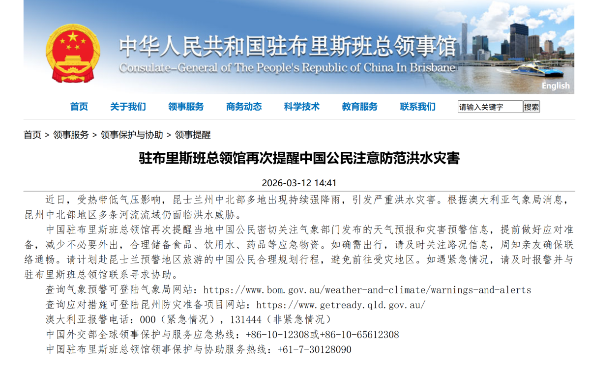 中國駐布里斯班總領事館近日發文再次提醒中國公民注意防範洪水災害,密切關注氣象部門發布的天氣預報和災害預警信息,提前做好應對準備,減少不必要外出,合理儲備食品、飲用水、藥品等應急物資。