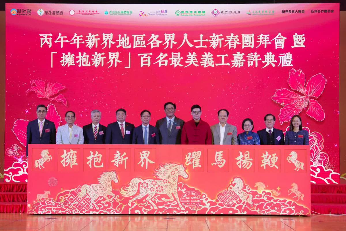 【點新聞報道】為慶祝丙午新春,凝聚新界力量,弘揚社區關愛互助精神,「丙午年新界地區各界人士新春團拜會暨『擁抱新界』百名最美義工嘉許典禮」3月13日於新界鄉議局大劇院隆重舉行。香港特別行政區行政長官李家超通過視頻致辭肯定新界各界在推動地區發展、服務社區、促進多元經濟等方面的重要貢獻。本次活動由新界社團聯會、新界鄉議局、香港工商總會、香港漁民團體聯會、香港婦聯、新界青年聯會、新界校長會、香港農業聯合會、新界各界大聯盟及新界各界慶委會聯合主辦,逾600位社會各界賢達、社區幹事及義工代表齊聚一堂,共賀新禧、同頌家園,見證嘉許盛典。