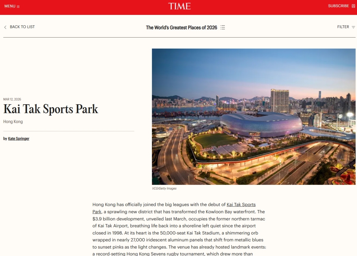【點新聞報道】啟德體育園獲《時代雜誌》選為「全球最佳勝地」之一,成為榜單中唯一入選的香港景點。《時代雜誌》形容啟德體育園為機場關閉後的沉寂海岸線注入活力,過去舉辦多場運動和娛樂活動,進一步鞏固香港作為體育和娛樂中心的地位。