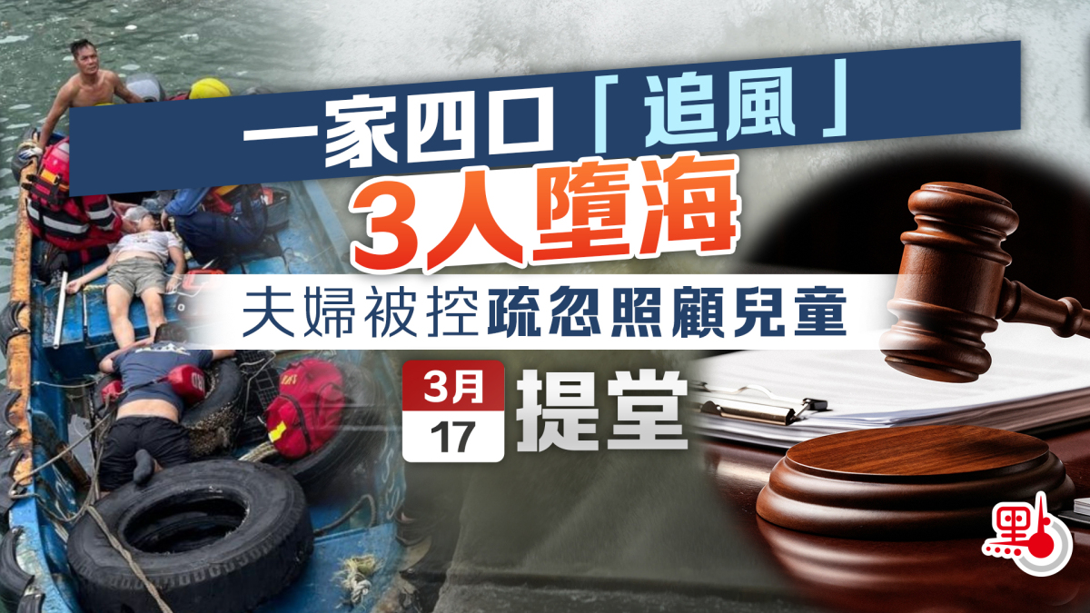 事發去年9月23日,天文台發出8號西北烈風或暴風信號期間,涉事家庭在仁孚港島汽車中心對開防波堤上觀浪。期間38歲姓李母親與5歲兒子被大浪捲落海,40歲姓甄父親跳海救人。3人由船家及消防救起,被送往東區醫院搶救,母子兩人一度情況危殆。一同觀浪的9歲女兒則無恙。