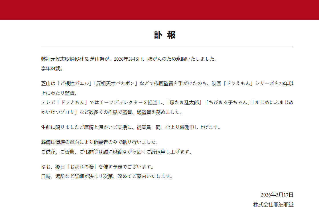 【點新聞報道】日本動畫製作公司亞細亞堂今日(17日)在官網宣布,曾擔任「多啦A夢」系列電影導演逾20年的芝山努,已於3月6日因肺癌過世,享年84歲。