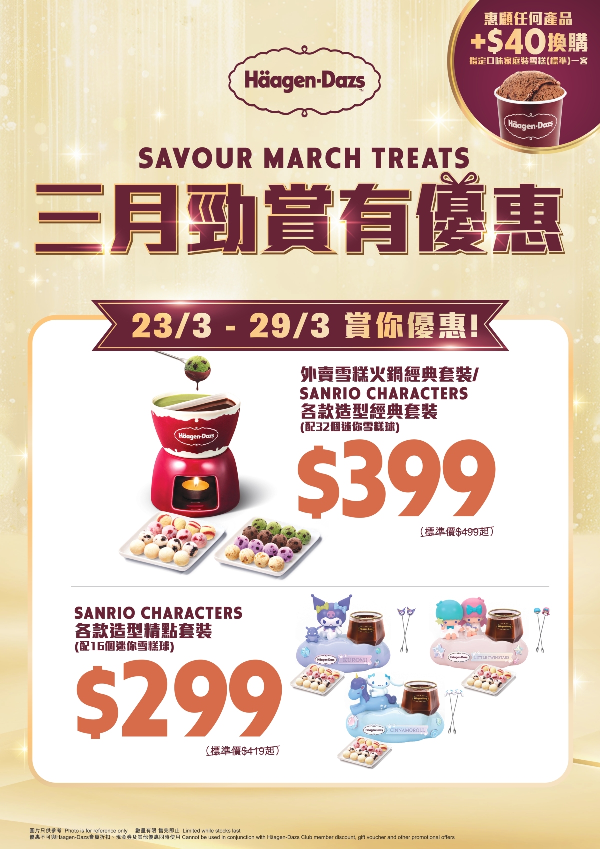 此外,於3月23日至29日期間,顧客只要於專門店惠顧任何產品,即可以HK$40加購指定口味家庭裝(標準)雪糕一客,高性價比必搶!同一推廣時段,人氣雪糕火鍋套裝亦於專門店及網上商店推出限時優惠——首推派對必備的「雪糕火鍋經典套裝」以8折驚喜價登場,配有32個迷你雪糕球,最適合家人朋友共享;而Sanrio粉絲更要把握最後機會,入手極度搶手的「Sanrio Characters造型套裝」,數量有限,售完即止。