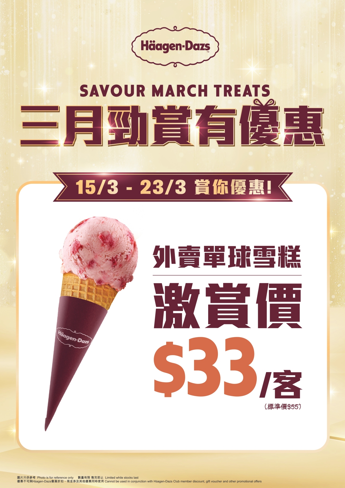 由即日起至3月23日期間,Häagen-Dazs專門店限時推出優惠,只需HK$33(標準價HK$55),即可享用外賣單球雪糕!