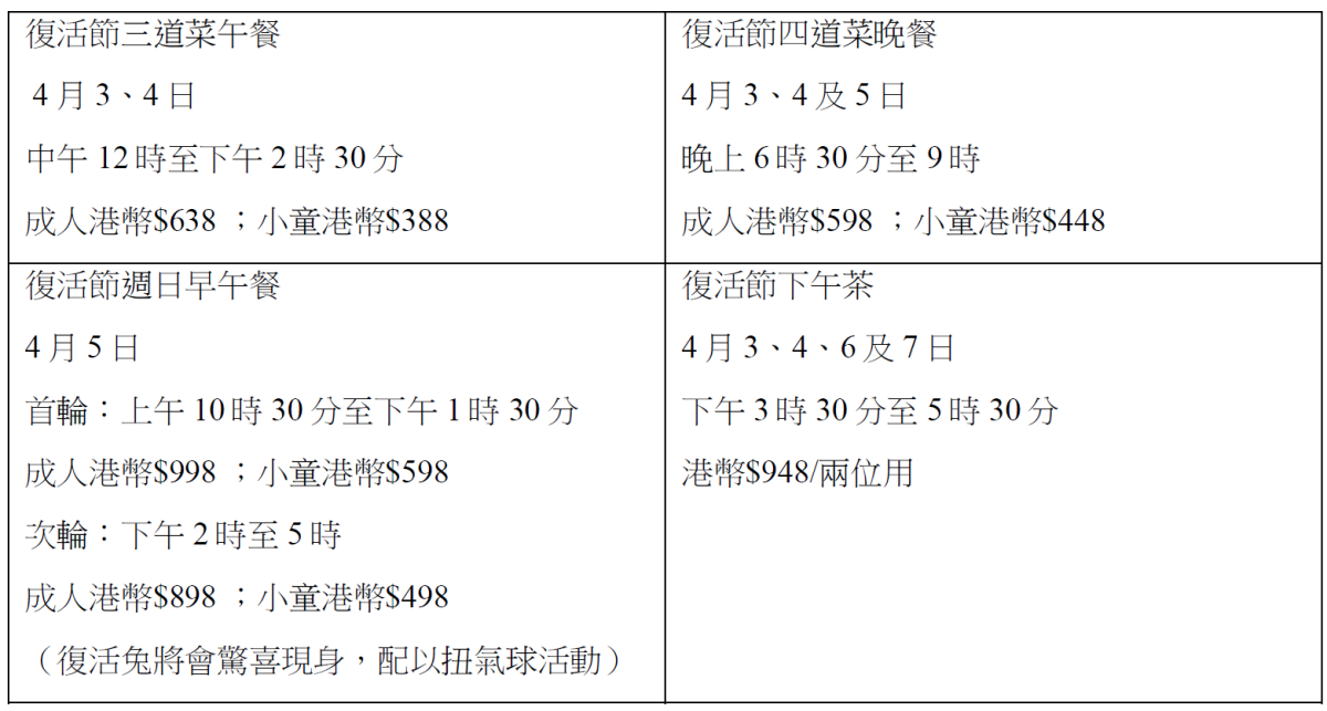 復活節早午餐將帶來豐盛的美食體驗,更有復活節兔子驚喜現身。賓客可細味豐富的海鮮盛宴、即席烹調美食,以及主菜選擇如羊肩肉卷,並享用主題節日甜品吧。此外,復活節下午茶為您於穿梭市集與工作坊之間提供完美的歇息時刻。