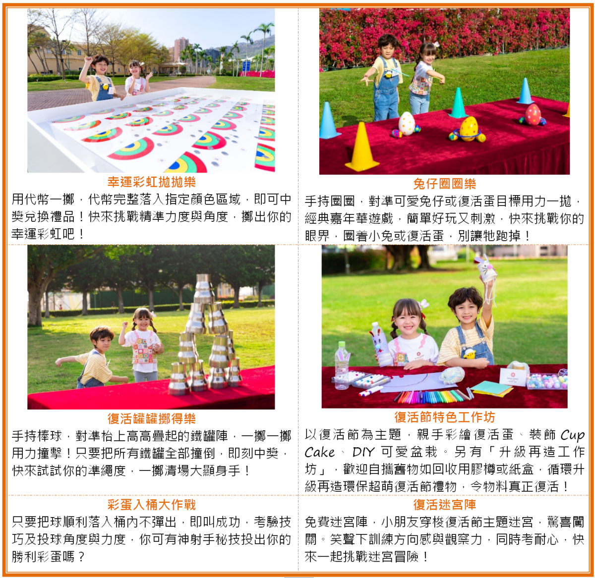 走在黃金海岸廣闊的5萬呎戶外草地上,無論是爸爸媽媽還是小朋友,都能感受到大自然的自由與無拘無束,可以盡情玩樂、釋放活力!今年小朋友至愛的尋蛋遊戲「尋蛋樂」強勢回歸,收集特定彩蛋換獎品,今年特別加入可持續元素:尋獲「環保3D打印彩蛋」即可得到大獎!「遙控挖泥車掘蛋大作戰」邊玩邊體現STEAM多個核心概念;「大型滾蛋之旅」極考驗手腳協調,與巨蛋並肩作戰衝向終點;走入「復活迷宮陣」跟爸媽及小朋友你追我逐,放電好時機;再來挑戰擲彩虹、拋圈圈等嘉年華必玩遊戲,一同大顯身手贏獎品!愛手作的小朋友還可以到「復活節特色工作坊」,製作可愛滿分的復活節禮物。