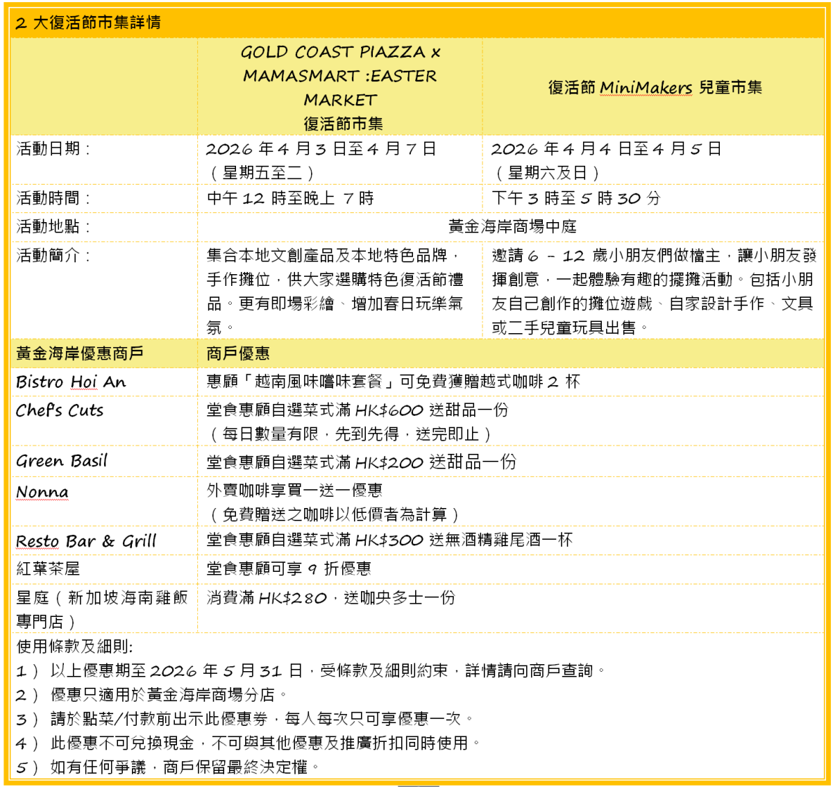 免費入場的復活節市集將由4月3日至7日舉行,並首度以雙市集形式進行,包括:黃金海岸商場中庭復活節市集,匯聚眾多文創手作與本地特色品牌,獨一無二的心動好物等你發掘!現場更有即場彩繪體驗,為春日增添繽紛色彩。而「復活節MiniMakers兒童市集」則讓小朋友變身小小檔主,帶來小遊戲、工作坊、二手玩具義賣等,寓教於樂推廣惜物及理財理念。