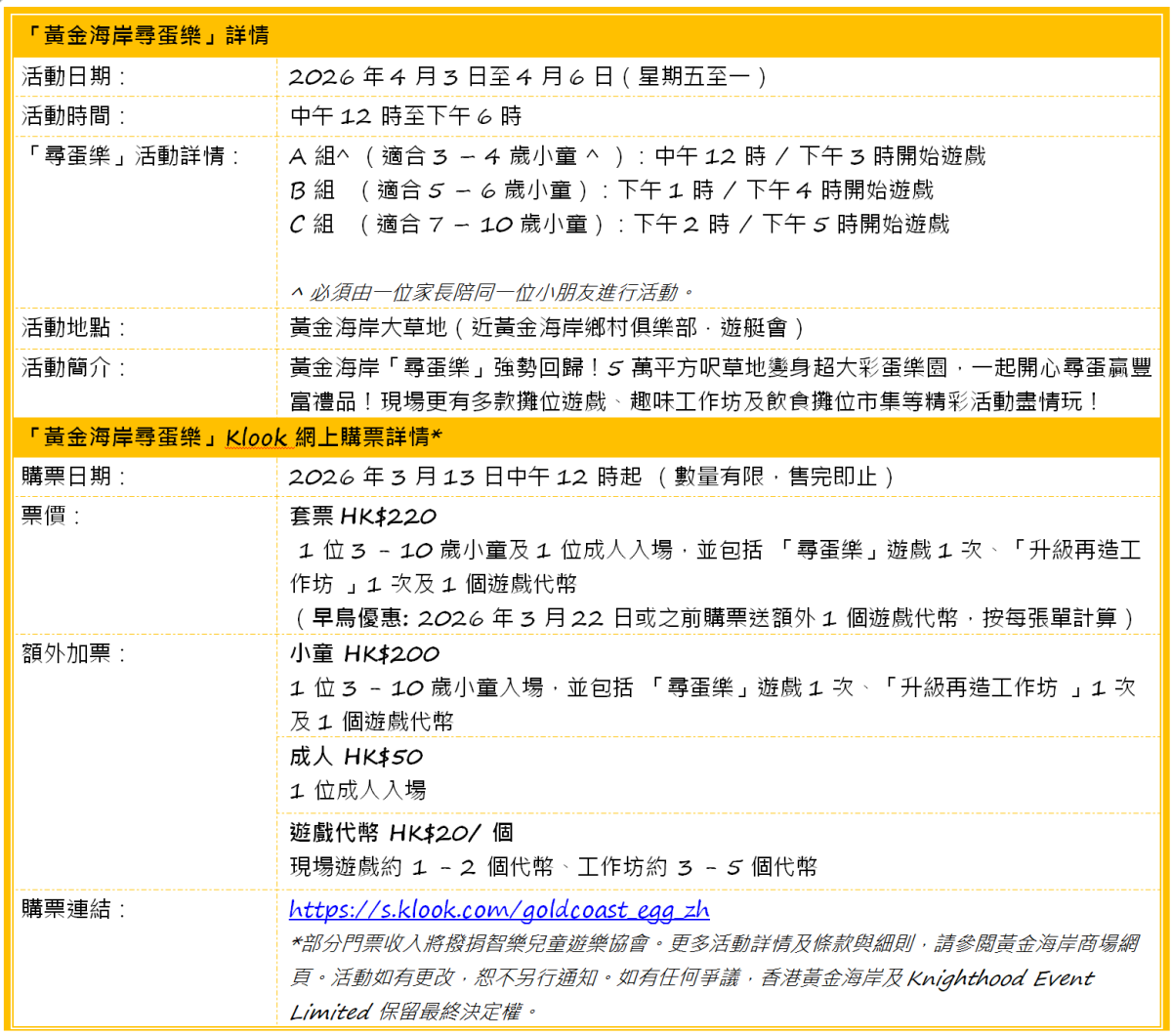 黃金海岸於4月3日至6日舉辦「黃金海岸尋蛋樂」,孩子們可於超過5萬平方呎草坪上盡情玩樂,小朋友至愛的尋蛋遊戲「尋蛋樂」今年強勢回歸,更帶來9大遊戲體驗,玩累了不妨到「復活美食市集」品嘗本地製作復活節美味,入場的參加者將獲贈活動小冊子,內含商場多項餐飲優惠券,送越式咖啡、無酒精雞尾酒、甜品等,讓大家玩樂後能即享美食充電。
