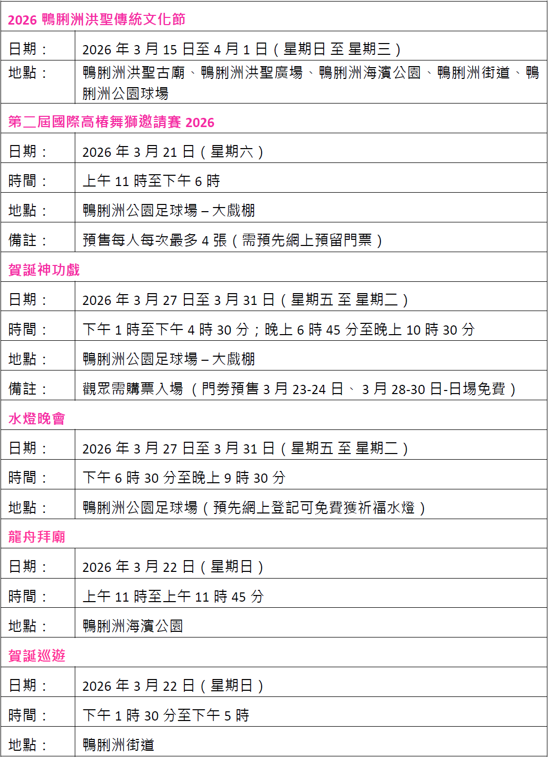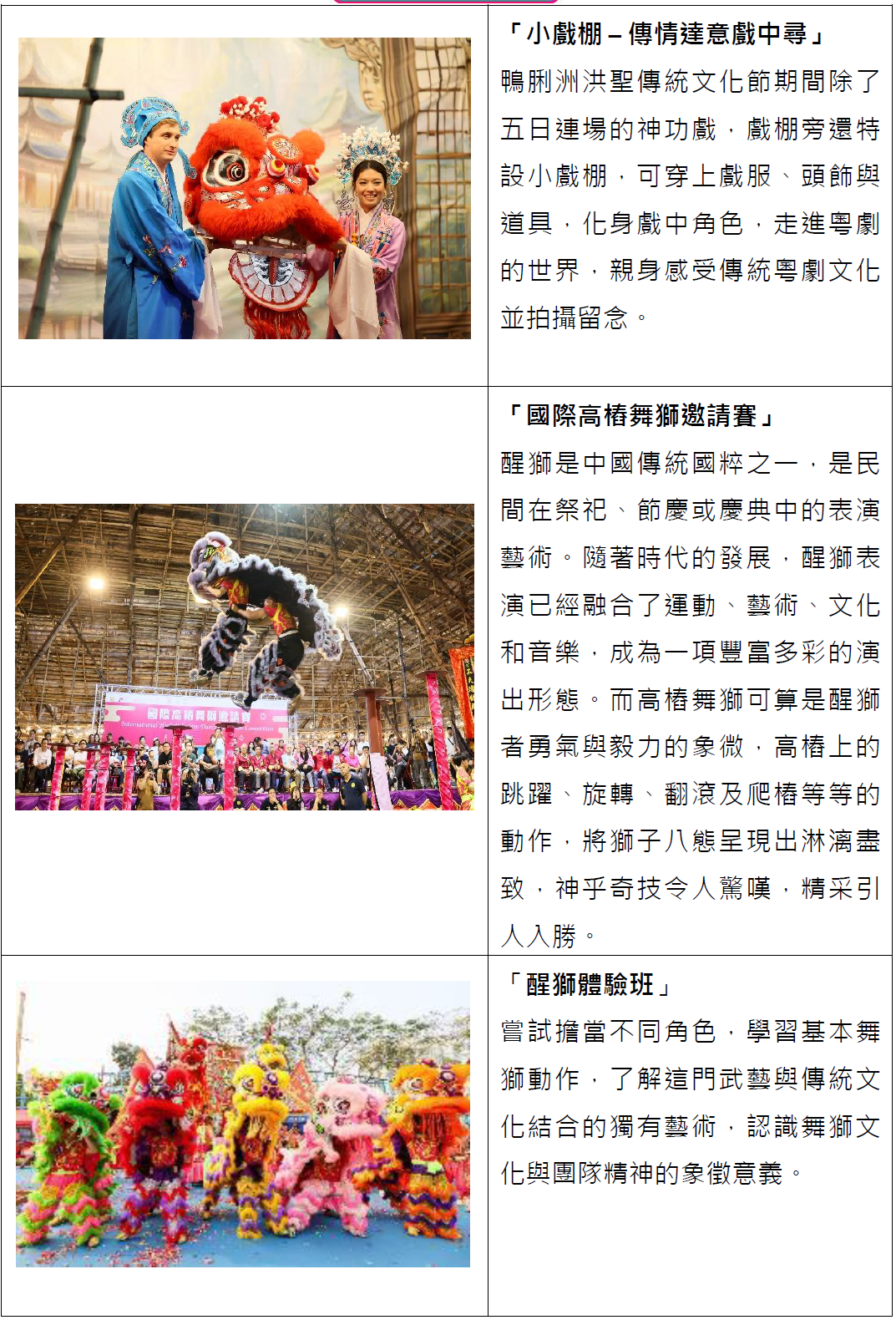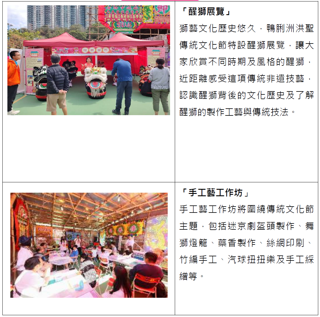 3月28日文化節特設3場洪聖傳統文化導賞團活動,邀請公眾乘觀光船遊覽香港仔避風塘、參觀歷史悠久的洪聖古廟、遊走大戲棚認識粵劇文化了解洪聖誕的由來及文化意義。國際高樁舞獅邀請賽3月21日載譽歸來,邀請到內地、澳門、香港、馬來西亞、新加坡等合共13隊頂尖醒獅隊伍來港,與香港隊一較高下。為登上首屆「高樁之王」寶座,各地醒獅競技精英將於高達3米的梅花樁陣中大顯身手與默契,展現醒獅競技獨有的美感及力量。鴨脷洲洪聖傳統文化節另一重點必備項目——賀誕神功戲演出,今年將繼續由名伶蓋鳴暉的鳴芝聲劇團敲響鑼鼓,於3月27日至31日演出《紫釵記》《梁祝》《帝女花》等共11個經典戲寶,觀眾除了可欣賞經典粵劇,還能感受獨特的築棚工藝,體驗粵劇與傳統工藝交織的文化魅力。
