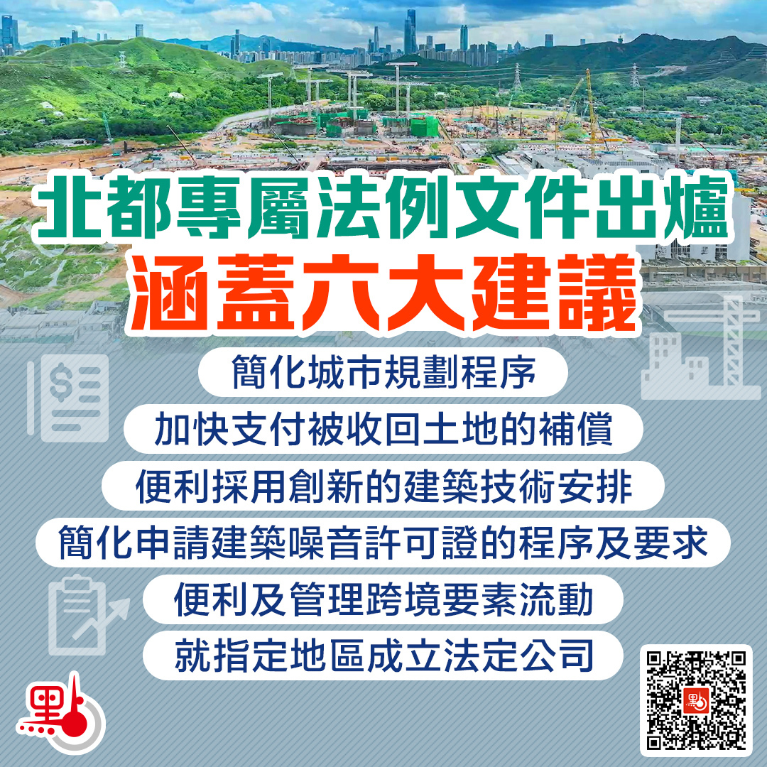 再來關注北都專屬法例。「加快北部都會區建設」首次列入國家「十五五」規劃綱要,標誌着北都發展正式升格為國家層面的戰略部署。發展局今日(17日)向立法會提交文件,介紹為加快北都發展訂立專屬法例的構思。建議由 3 月 24 日至 5 月 22 日進行約兩個月的公眾諮詢,期望法例可在今年內通過,進一步為北都發展提速提效。
