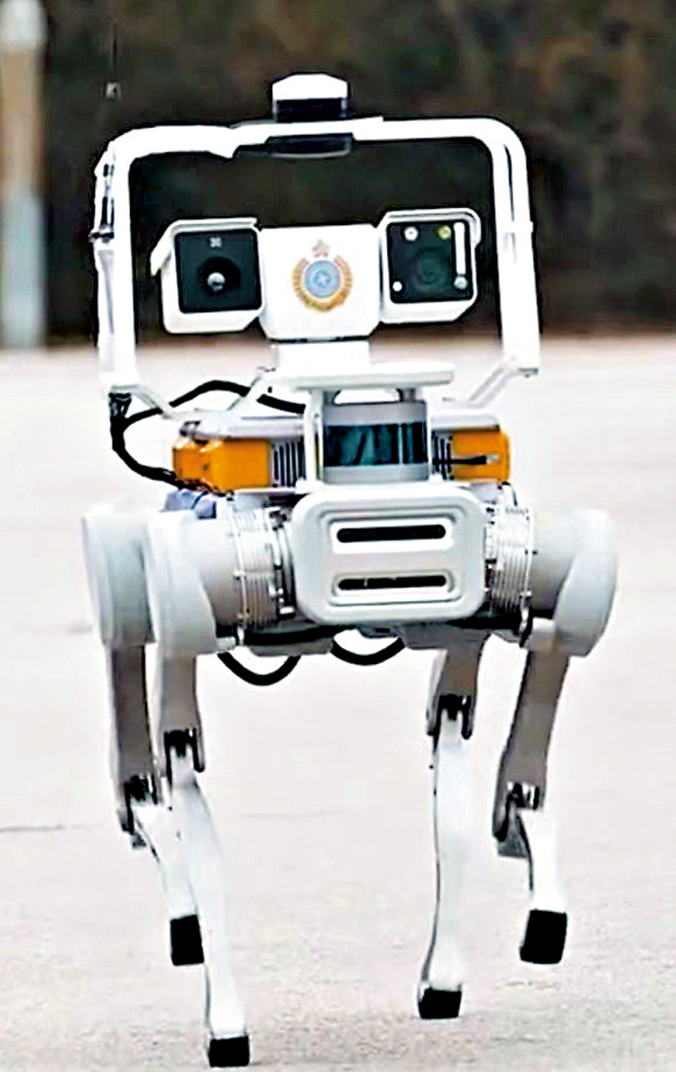 懲教署長期高度重視智慧監獄的建設與發展,希望透過各類高科技手段,協助提升院所整體保安水平與治理效能,已在實際工作引入多項創新科技,院所保安巡邏使用「無人機自動巡邏監察系統」,針對多數懲教設施位於郊野山嶺、人工巡邏難度大、環境艱苦且耗費人力的問題,引入機械狗(圖)開展地面巡邏工作,以科技手段替代部分人工巡邏,不僅有效節省人力成本,還能夠增加巡邏次數,強化院所外圍的保安水平。