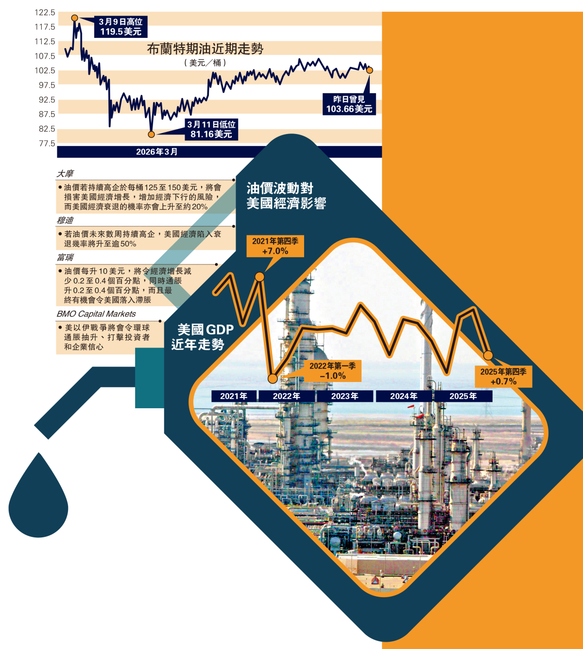 中東戰事衝擊原油供應,評級機構穆迪預測,若油價未來數周持續高企,美國經濟陷入衰退的幾率將升至逾50%。富瑞認為,油價每升10美元,將令美國經濟增長減少0.2至0.4個百分點,同時通脹升0.2至0.4個百分點。投行摩根士丹利相信,若油價繼續急升,美國經濟衰退幾率將升至約20%。