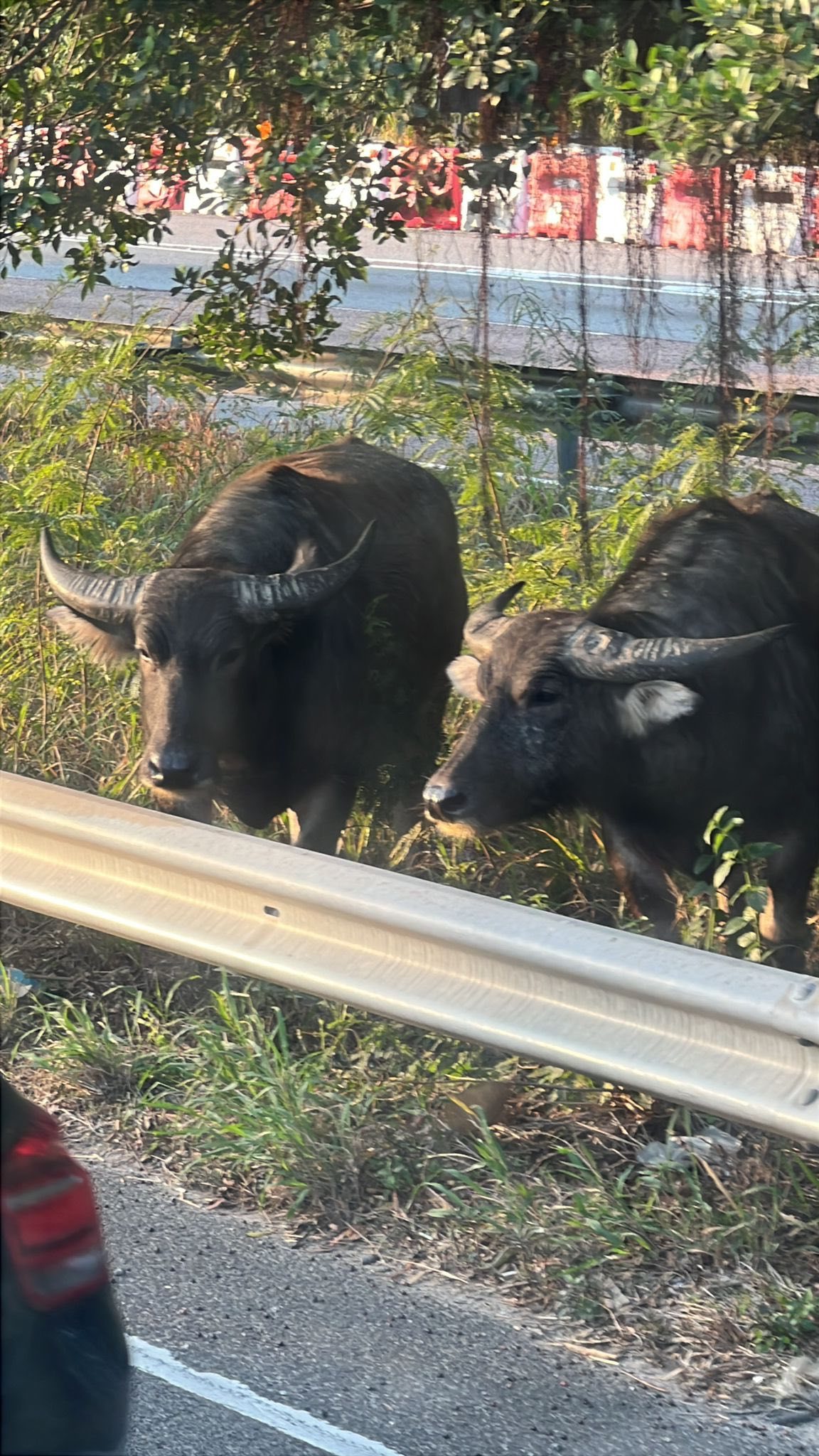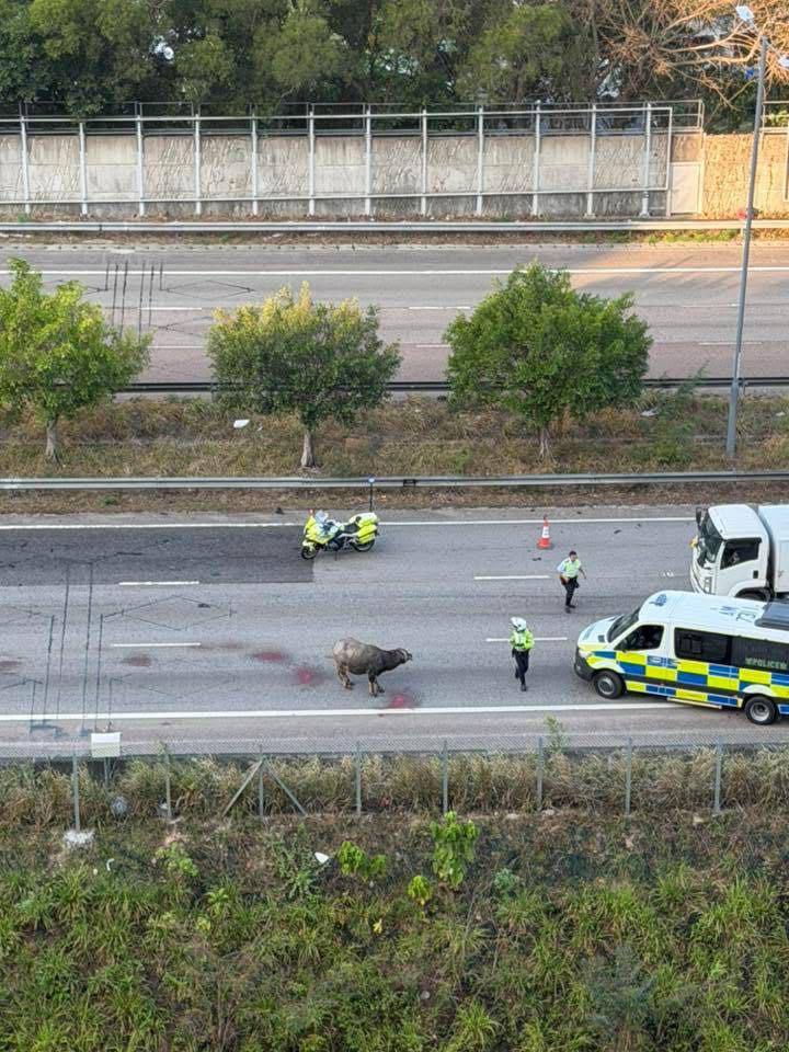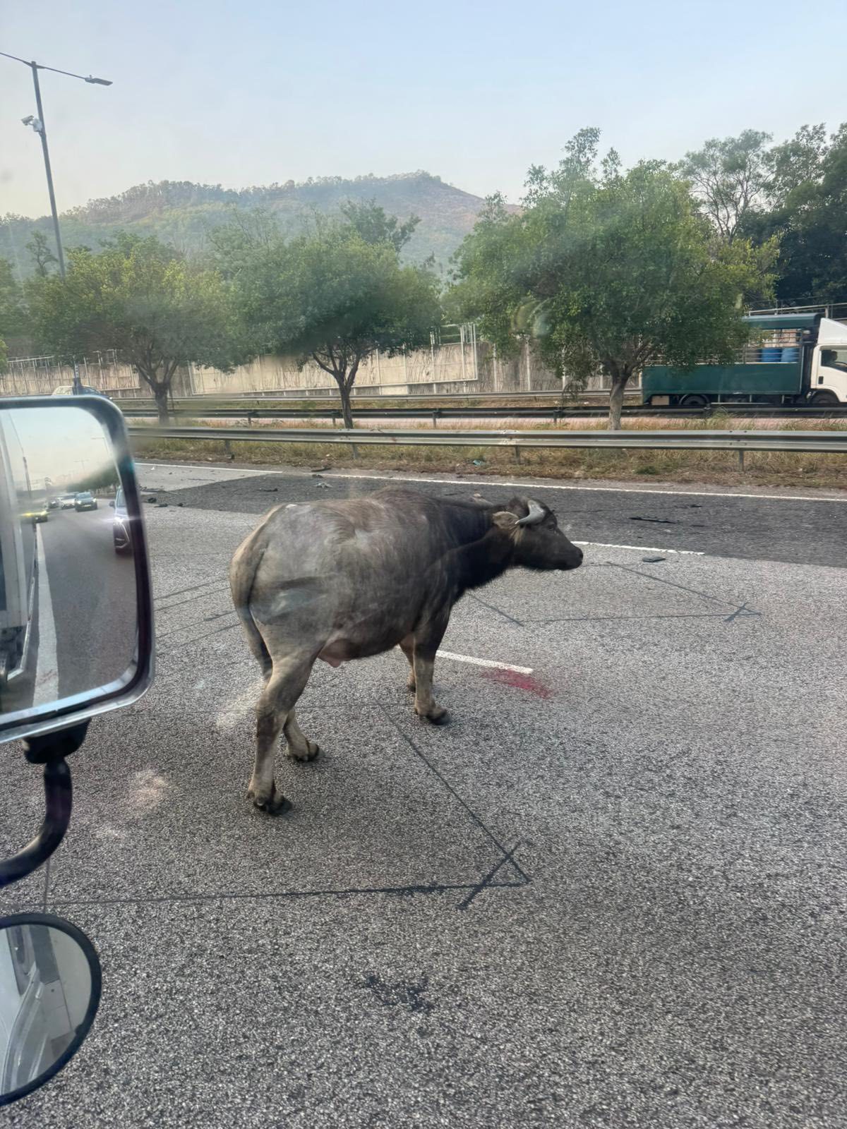 【點新聞報道】青朗公路牛出沒!事發今早(18日)上午7時許,警方接報指一輛私家車沿青朗公路往九龍方向行駛,至近錦上路港鐵站對開,突然撞到一隻闖入公路的牛。有網民拍到牛隻在公路徘徊畫面,可見牛隻受傷淌血,地面遺下大片血跡,途經的車輛紛紛慢駛繞道前行,另有兩隻牛匿在草叢。涉事私家車則停在近快線位置,零件碎片散落一地。