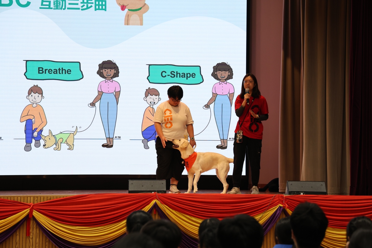 活動以「接觸」為主題,旨在透過動物輔助介入服務,幫助學生紓解學習壓力、提升身心健康,並預防情緒困擾或隱蔽傾向。開場由專業講者介紹與狗隻相處的正確要點,包括如何安全接近、撫摸及溝通,讓同學們學會尊重動物界限。隨後,STAR和JUNE在訓導員引領下,展現多項專業社工狗狗技能表演:從簡單的「坐下」、「握手」到更複雜的「取物」、「安撫」動作,牠們溫順聽話、眼神充滿關愛,贏得全場陣陣掌聲與驚嘆。