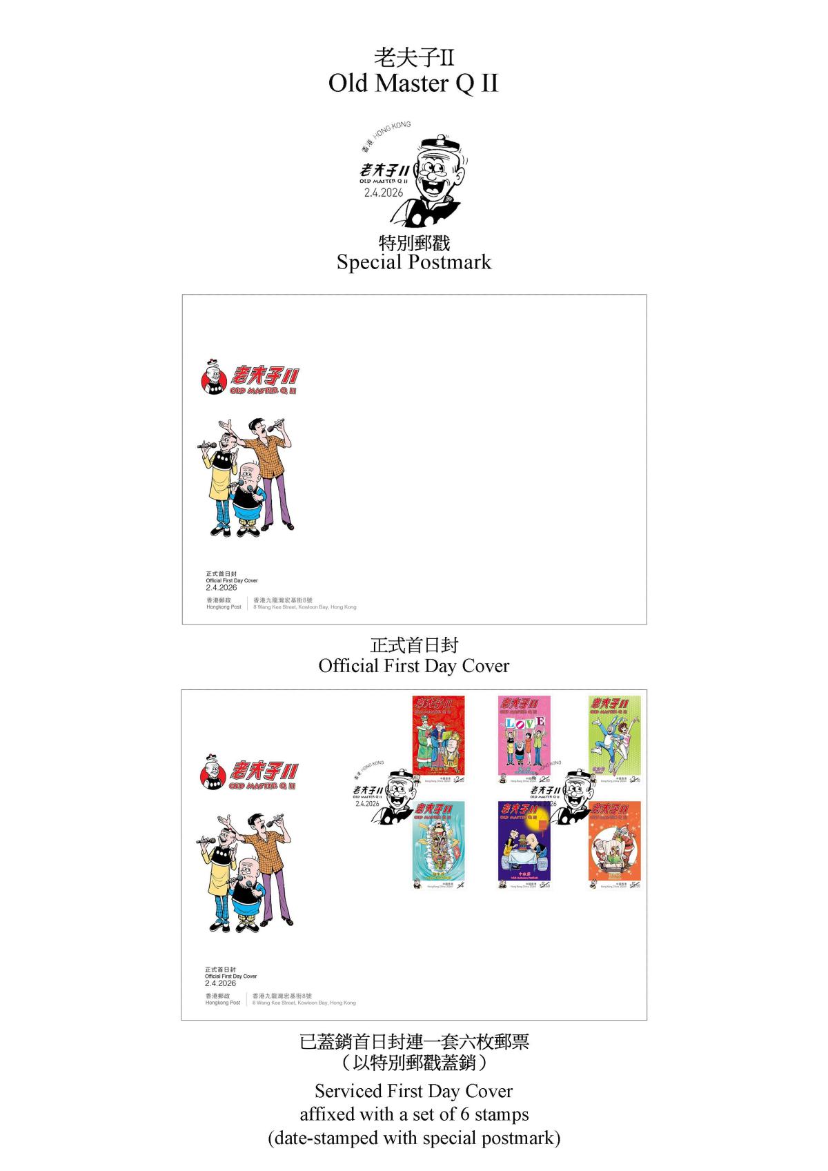 全線郵政局和香港郵政網上購物平台「郵購網」由明日(19日)起發售「老夫子II」正式首日封。這套特別郵票及相關郵品將於4月2日起在各郵政局及「郵購網」發售,而貼有特別郵票的已蓋銷首日封、郵資已付圖片卡(空郵郵資)及紀念套摺只限在集郵局發售。各郵政局將於4月2日為所有正式首日封/紀念封/註明首日字樣和本地地址的自製封,提供即時人手蓋印服務。