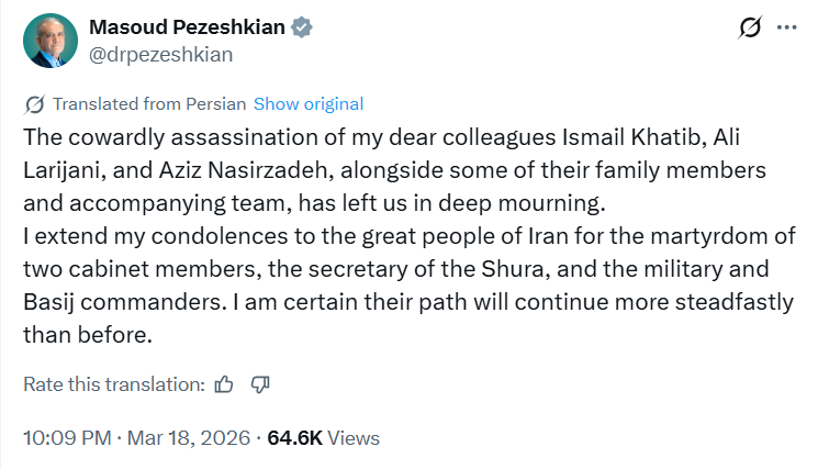 【點新聞報道】據央視新聞報道,伊朗總統佩澤希齊揚3月18日在社交媒體證實伊朗情報部長伊斯梅爾·哈提卜遇害。