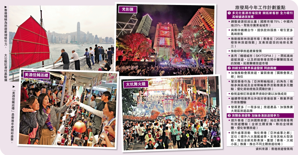 香港旅遊發展局昨日宣布,今年度將循三大策略推動旅遊發展,開拓新客群,加強香港旅遊競爭力,全力吸引高增值過夜旅客。旅發局將提升盛事活動,加強推廣中西傳統節慶,今年舉辦的六大旗艦盛事將擴大規模與宣傳力度,美酒佳餚巡禮將在11月打造為「美酒佳餚月」,大坑舞火龍、萬聖節加入新元素。為提升夜間體驗,旅發局最快在夏季前,開始陸續推出以光影巡禮為主題的全新表演。