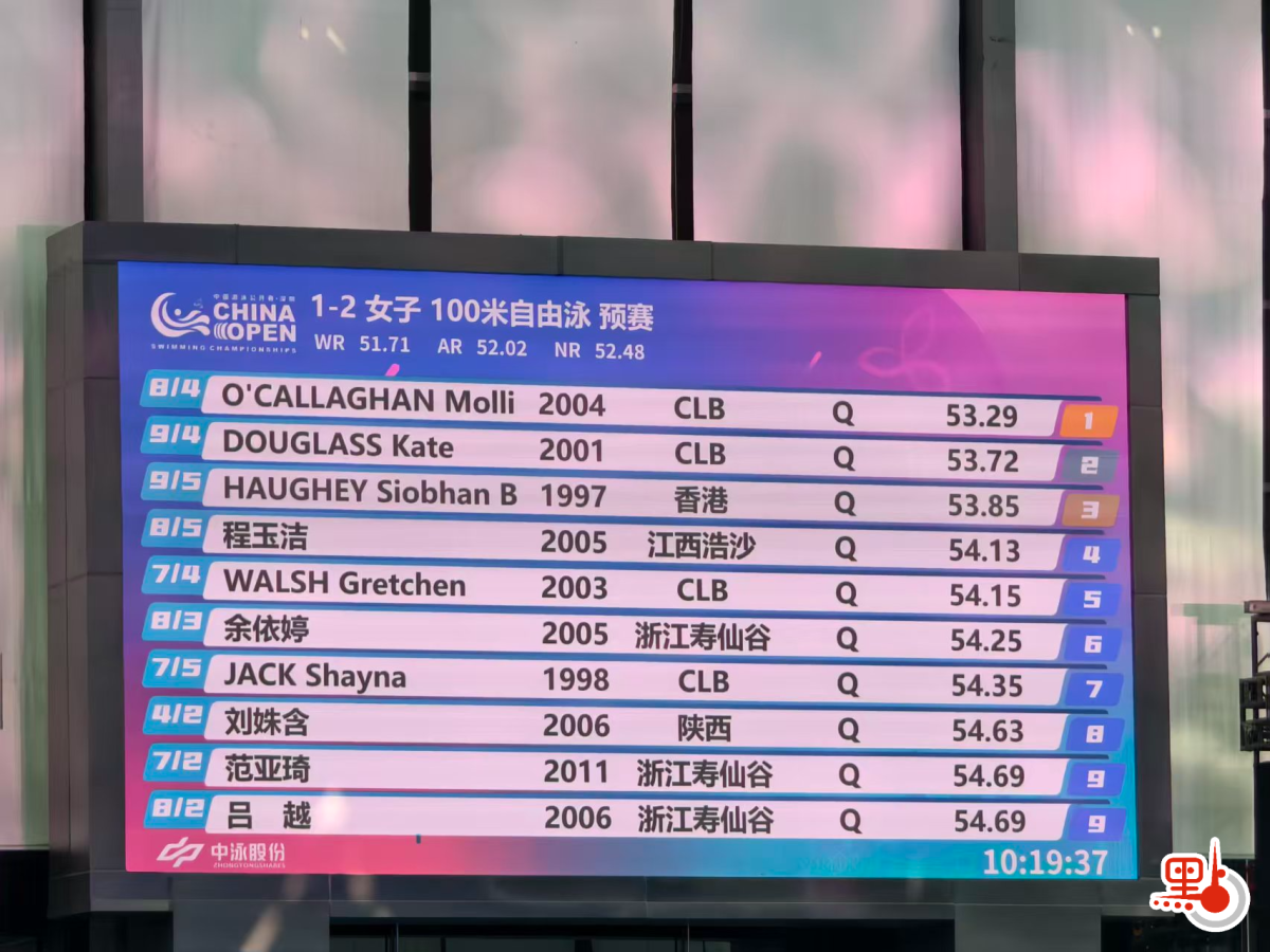 【點新聞報道】3月19日開啟的2026年中國游泳公開賽中,中國香港「女飛魚」何詩蓓在當天上午首次亮相,進行其主項女子100米自由泳預賽的角逐。澳大利亞選手Mollie O'Callaghan以53秒29位列第一,美國選手Kate Douglass游出53秒72的成績獲第二,何詩蓓以53秒85位列第三進入當晚決賽。