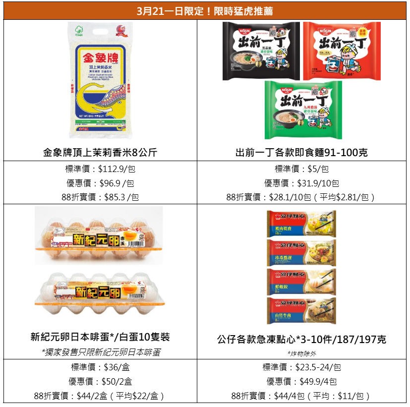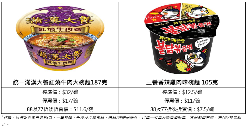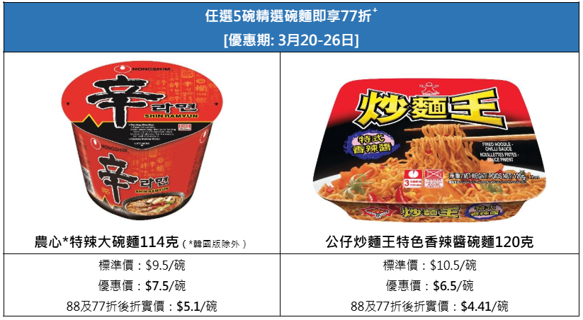 3月20日至26日期間,任選5款精選碗麵還能享額外77折,可與3月21日門市買滿$168「全場88折」快閃優惠同步使用,實行折上再折!優惠期內貨品種類包羅萬有,把握時機來掃貨吧!