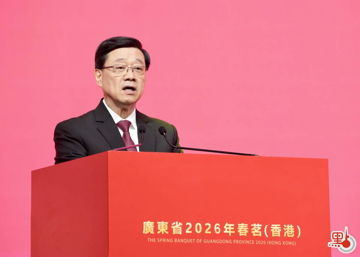 【點新聞報道】行政長官李家超今日(19日)出席廣東省2026年春茗(香港)並致辭。李家超表示,在丙午馬年,特區政府會馬不停蹄、策馬揚鞭,發揮好香港在「一國兩制」下背靠祖國、聯通世界的獨特優勢和重要作用。在新一年,他相信粵港之間的高水平合作將推上更高台階,為兩地人民的安居樂業共謀發展,為推進強國建設作出新的更大貢獻。