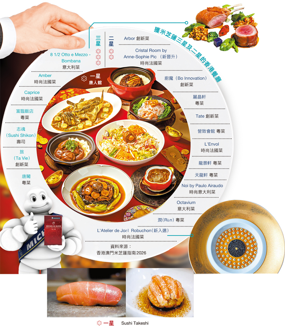 第十八屆《香港澳門米芝蓮指南2026》名單昨日(19日)出爐,香港餐飲界於國際評級大放異彩,共77間餐廳奪星,打破去年上榜餐廳紀錄。本年度的指南收錄278間餐廳,涵蓋米芝蓮星級、必比登推介及入選餐廳名單,包括219間香港餐廳及59間澳門餐廳。今年更新增首度於香港及澳門亮相的米芝蓮指南導師主廚大獎,表揚致力傳承烹飪藝術與知識予新一代的大廚。此外,5間餐廳蟬聯米芝蓮綠星,彰顯港澳兩地對未來餐飲的可持續承諾。