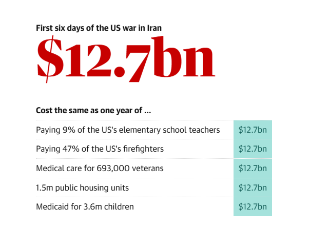 - 2月28日,美軍一枚戰斧導彈擊中伊朗一女子小學,造成175人死亡。單枚戰斧導彈造價約350萬美元。據估算,戰爭前6日美軍已發射超過300枚戰斧導彈,總耗資12億美元。美軍官員稱,截至第6日已打擊2500餘個目標。僅進攻性打擊彈藥的估算成本就達55億美元。
