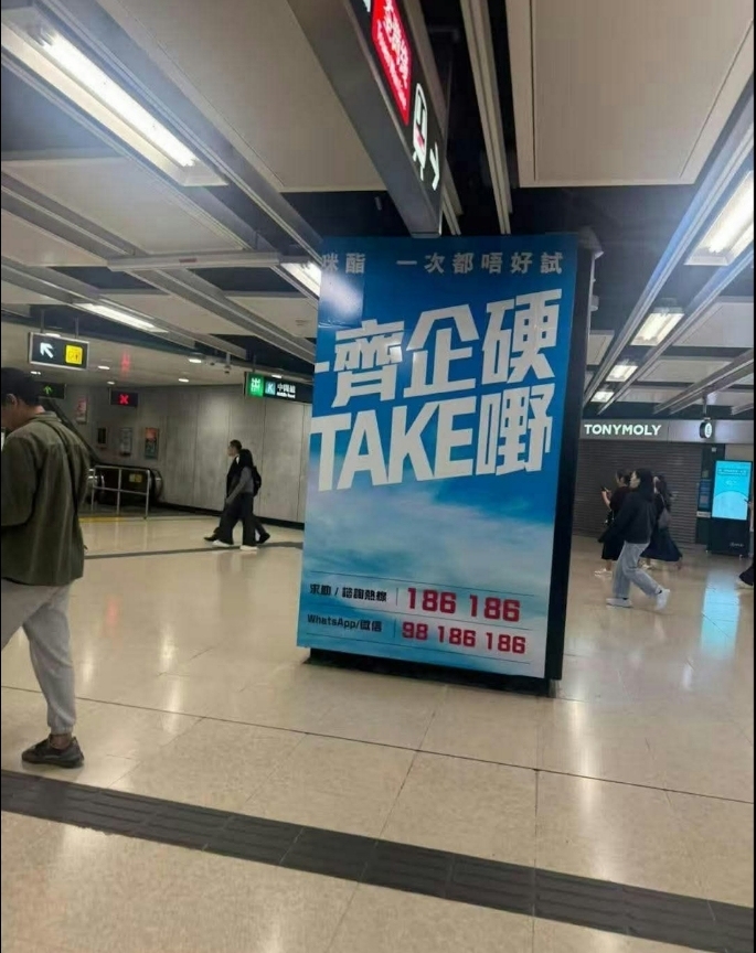 【點新聞報道】保安局禁毒處聯同禁毒常務委員會舉辦禁毒宣傳活動,在港鐵尖沙咀站展示巨型宣傳海報。社交平台19日流傳相片,港鐵站尖沙咀禁毒宣傳海報因柱躉展示版面面積問題,把「唔」字單獨放在柱的另一邊,令「一齊企硬 唔take嘢」標語,變成在柱面上呈現「齊企硬 Take嘢」,與原先意思完全相反。