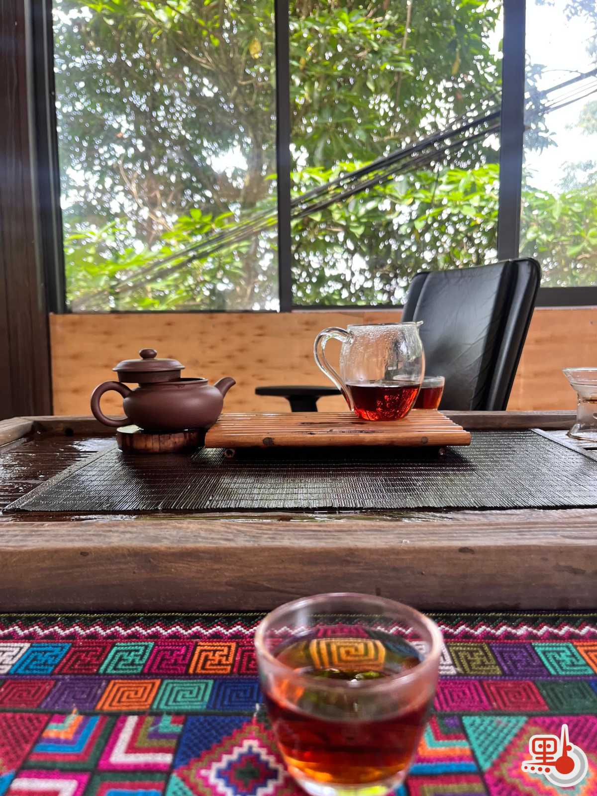 大土的茶室在山腰的木屋裏,窗外是一整片潮潤的綠。桌上擺着茶具和哈尼族編織的圖騰,牆邊堆着茶餅。他坐在窗前給我泡茶,我便這樣,第一回從頭到尾,認真地與一位茶農共飲一席茶。