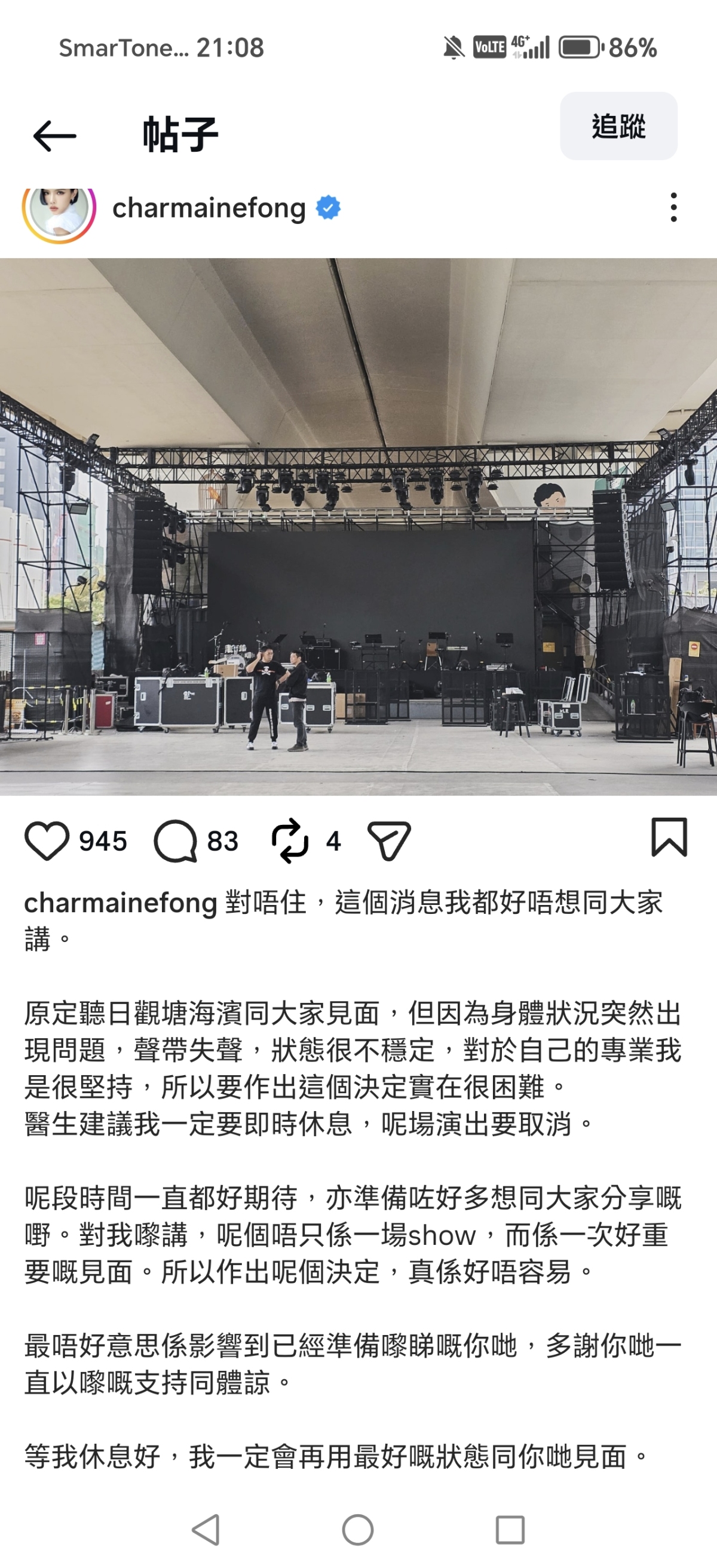 方皓文亦在社交平台發文交代:「因為身體狀況突然出現問題,聲帶失聲,狀態很不穩定,對於自己的專業我是很堅持,所以要作出這個決定實在很困難。醫生建議我一定要即時休息,呢場演出要取消。呢段時間一直都好期待,亦準備好多想同大家分享嘅嘢。對我講,呢個唔只係一場show,而係一次好重要嘅見面。所以作出個決定,真係好唔容易。最唔好意思係影響到已經準備嚟睇嘅你哋,多謝你哋一直以來嘅支持同體諒。等我休息好,我一定會再用最好嘅狀態同你哋見面。」