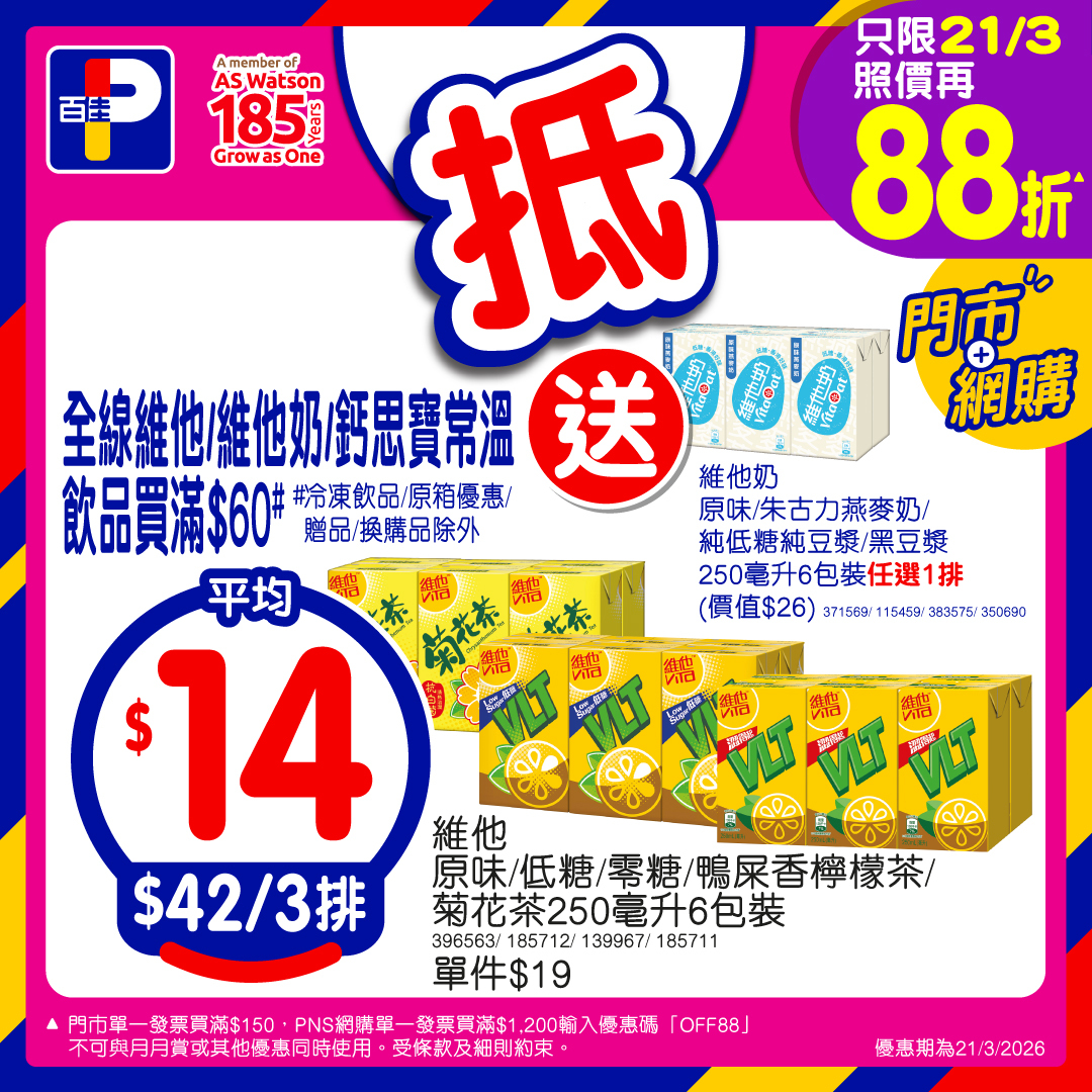維他原味/低糖/零糖/鴨屎香檸檬茶/菊花茶250毫升6包裝 $42/3排(平均$14/排)買滿$60再送維他奶250毫升6包裝1排(價值$26)
